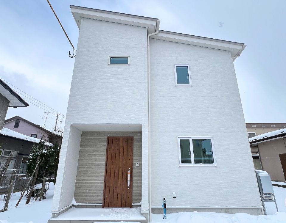 白を基調としたシンプルな切妻デザイン 所々に家族のこだわりが散りばめられたお家