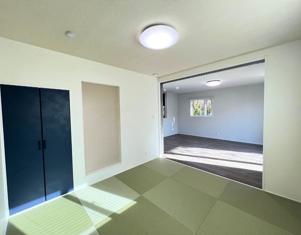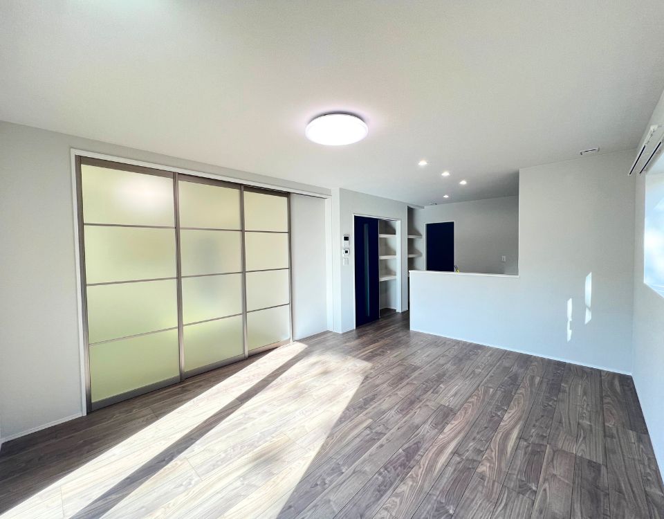 約16帖のLDKは3連片引き戸で仕切りが可能な和室が続き間となっています。アルミタイプの建具が空間にマッチしていて扉を閉めた状態でもおしゃれな印象に。