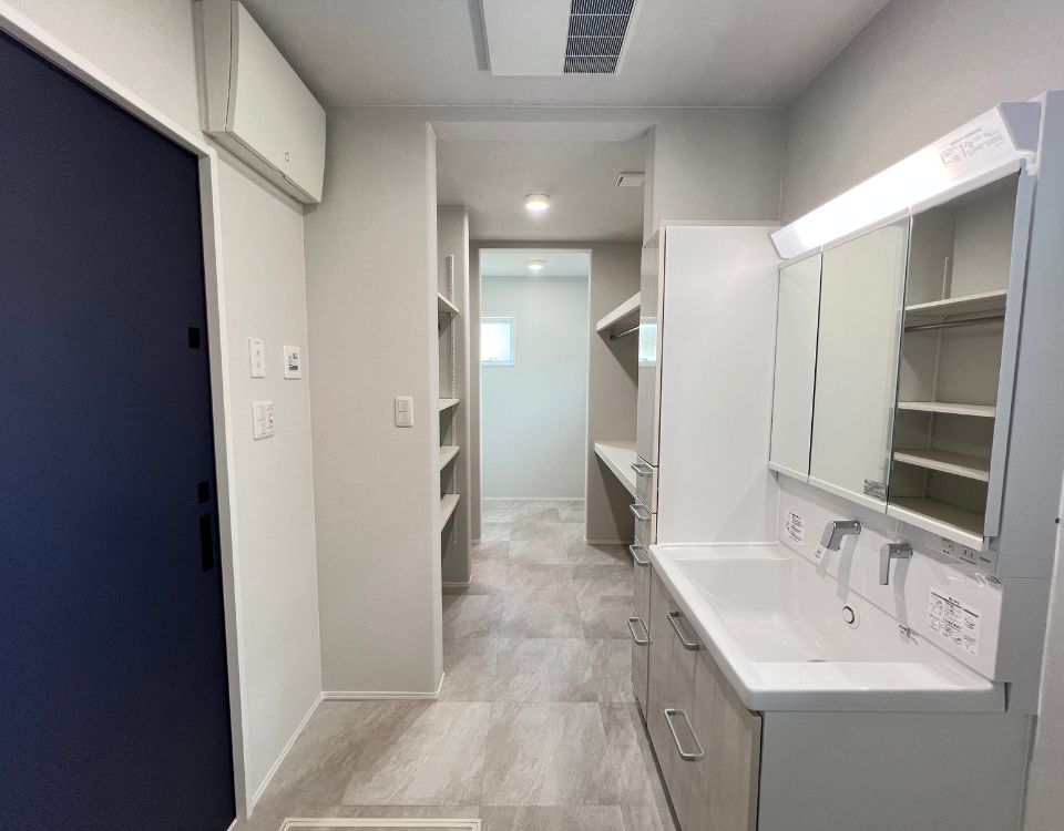 浴室からサンルームまで一直線の洗濯動線。しっかり収納できるWICやホスクリーンを設置した物干しスペースなど家事効率がしっかり考えられています。