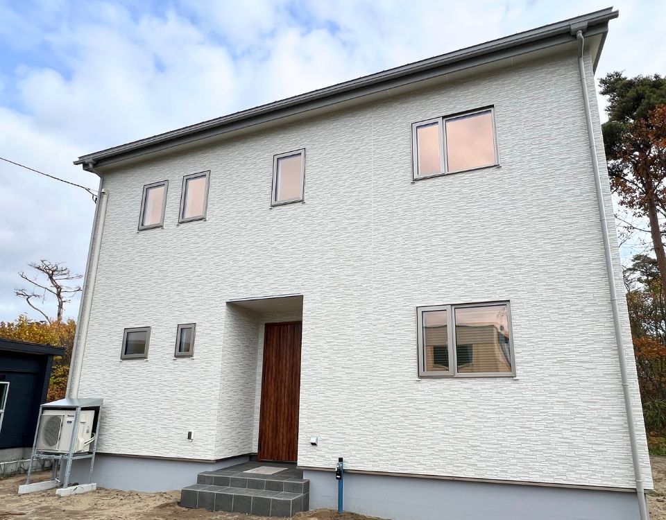 ホワイトを基調とした外壁と、木目調の玄関ドアの相性がとてもGOOD◎シンプルイズベストな外観が完成しました。外壁は『旭トステム ヴェリエ/ヴェリエホワイト』を採用しています。