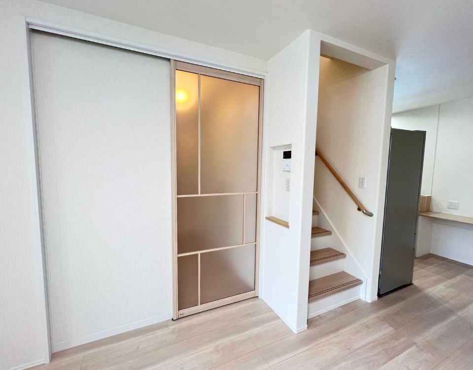 リビング引き戸は、空間をやわらかく仕切りつつ光を確保。おしゃれなデザインが目を惹きます。サイドには機能的なリモコンニッチを設置しました。