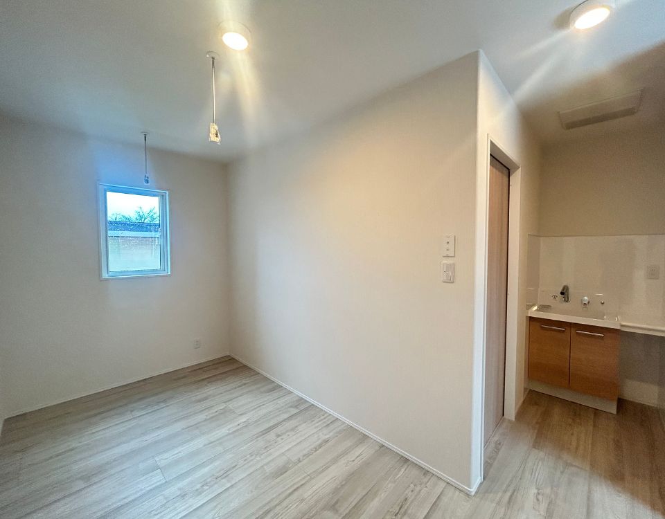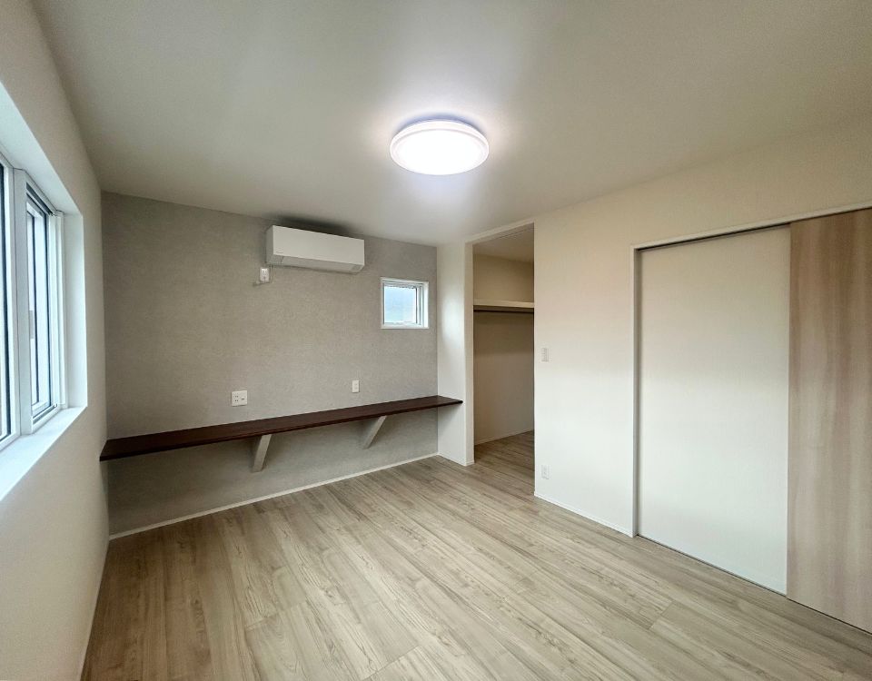造作カウンターを備えた寝室は、在宅ワークや趣味の時間にも対応できる多目的空間。アクセントクロスが程よい奥行きを生み、収納力のあるウォークインクローゼットと合わせて、すっきりとした暮らしを叶えます。