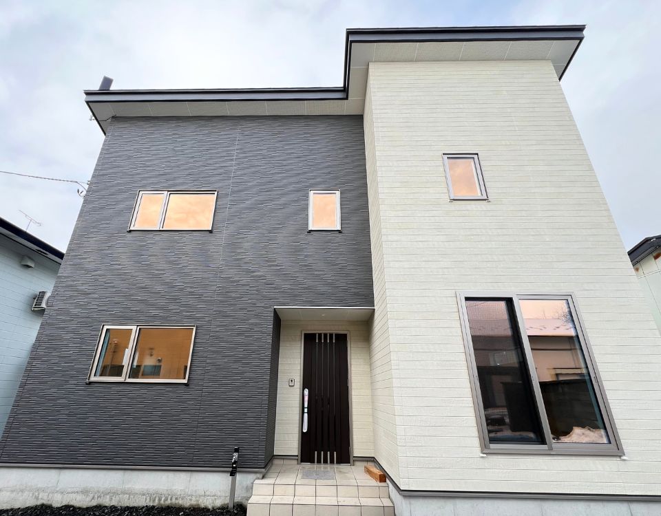 白を基調としたシンプルな切妻デザイン 所々に家族のこだわりが散りばめられたお家