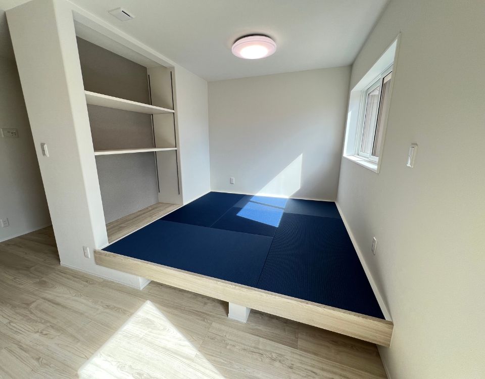 インディゴカラーが映える小上がりタタミスペースです。横に設置された収納スペースは可動棚タイプなので用途に応じて棚の高さを変更できます。背面のアクセントクロスが素敵ですね。