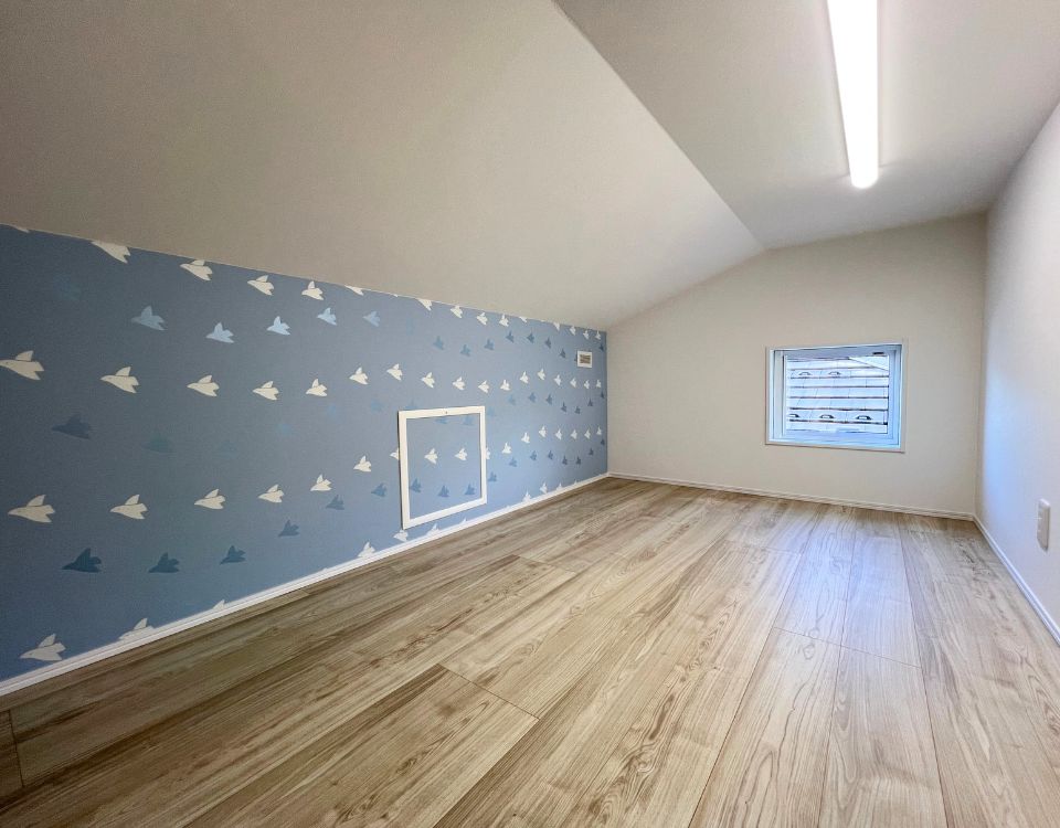 かわいらしいアクセントクロスが見える小屋裏収納スペースです。名の通り、収納スペースとしても趣味やくつろぎの空間としても活躍しそうですね。