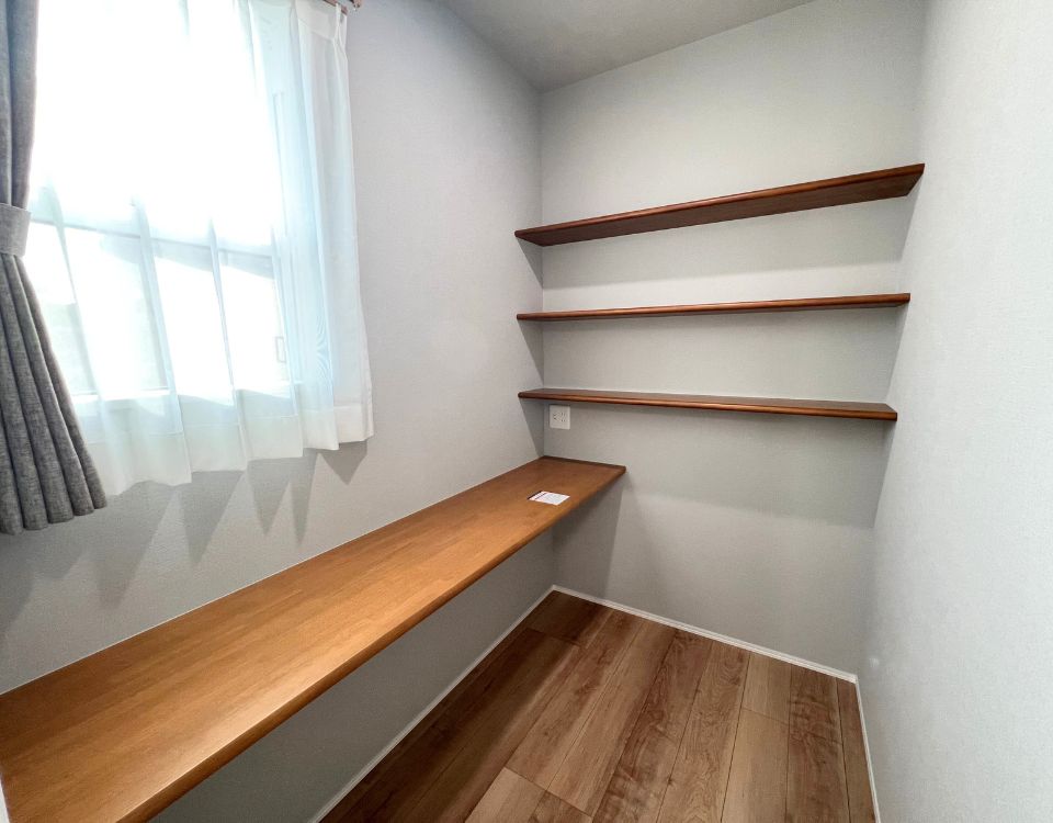 窓からやわらかな光が差し込む、コンパクトな書斎スペース。造作カウンターと壁面棚を組み合わせ、作業と収納を一体化しました。読書や在宅ワーク、趣味の時間まで幅広く使える落ち着きのある空間です。