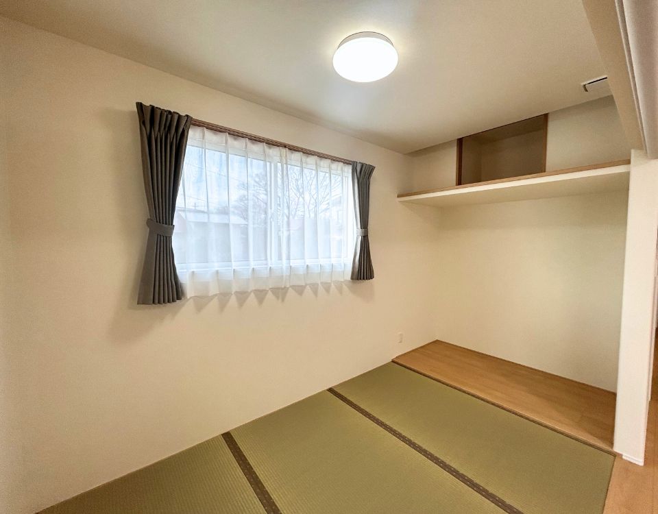 畳のやさしい香りに包まれる、落ち着きのある和の空間。窓からやわらかな自然光が差し込み、日中は照明いらずの心地よさを実現しました。神棚を設置し実用性も考えられた設計になっています。