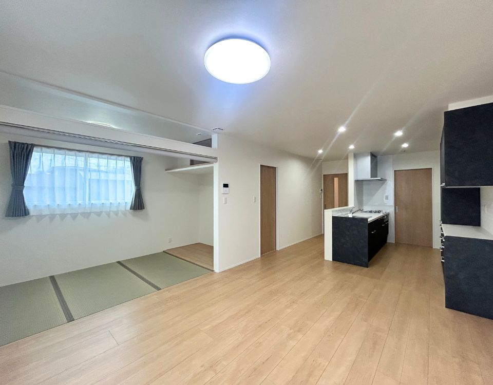 2階建て仕様の子世帯のLDKは木目の床が空間全体に温もりを与えます。キッチンは下がり天井を採用し空間に奥行きが感じられるようにしています。小上りタタミスペースは多目的に使える心地よい居場所に。暮らしやすさとデザイン性を両立しています。