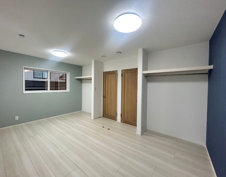 淡い木目の床に、やさしい色合いのアクセントクロスが映える居室。将来的には壁を追加し部屋を分けることも見据えた設計になっています。オープン収納を設けることで、使いやすさと見た目の軽やかさを両立しました。