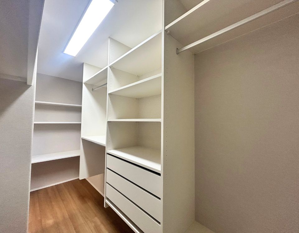 天井まで使える造作収納を備えた、すっきりとしたウォークインクローゼット。棚・引き出し・ハンガーパイプをバランスよく配置し、衣類や小物を用途別に整理できます。上部からのやわらかな光が、毎日の身支度を心地よい時間に変えてくれます。