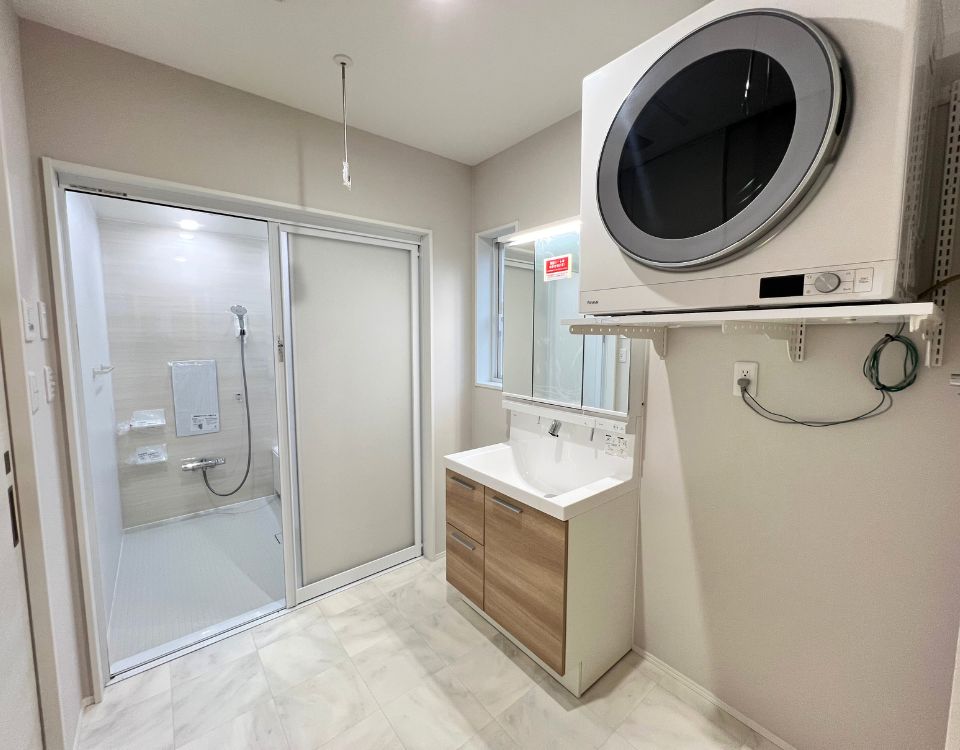 脱衣室と洗面室をゆったり確保し、毎日の家事がスムーズに進む空間に仕上げました。『乾太くん』を設置することで、天候や時間を気にせず洗濯が完結。清潔感のある内装と使いやすい収納計画により、身支度から洗濯までを快適に支える、機能性の高い水まわり空間です。