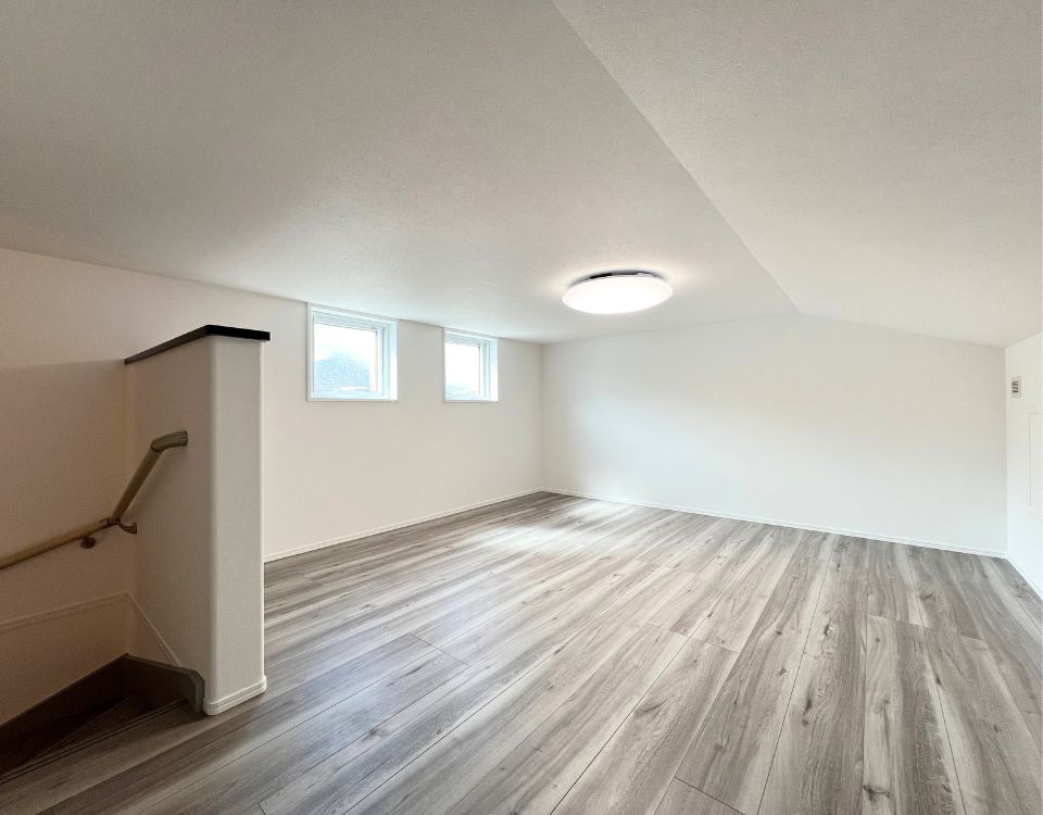 屋根形状に沿った勾配天井が、空間に広がりと個性をもたらす小屋裏スペース。視線の抜ける低窓から自然光が入り、明るさを確保しながらも落ち着いた居心地に仕上げました。ゆとりある広さを活かして、収納はもちろんワークスペースや遊び場など、ライフスタイルに合わせて柔軟に使える空間です。