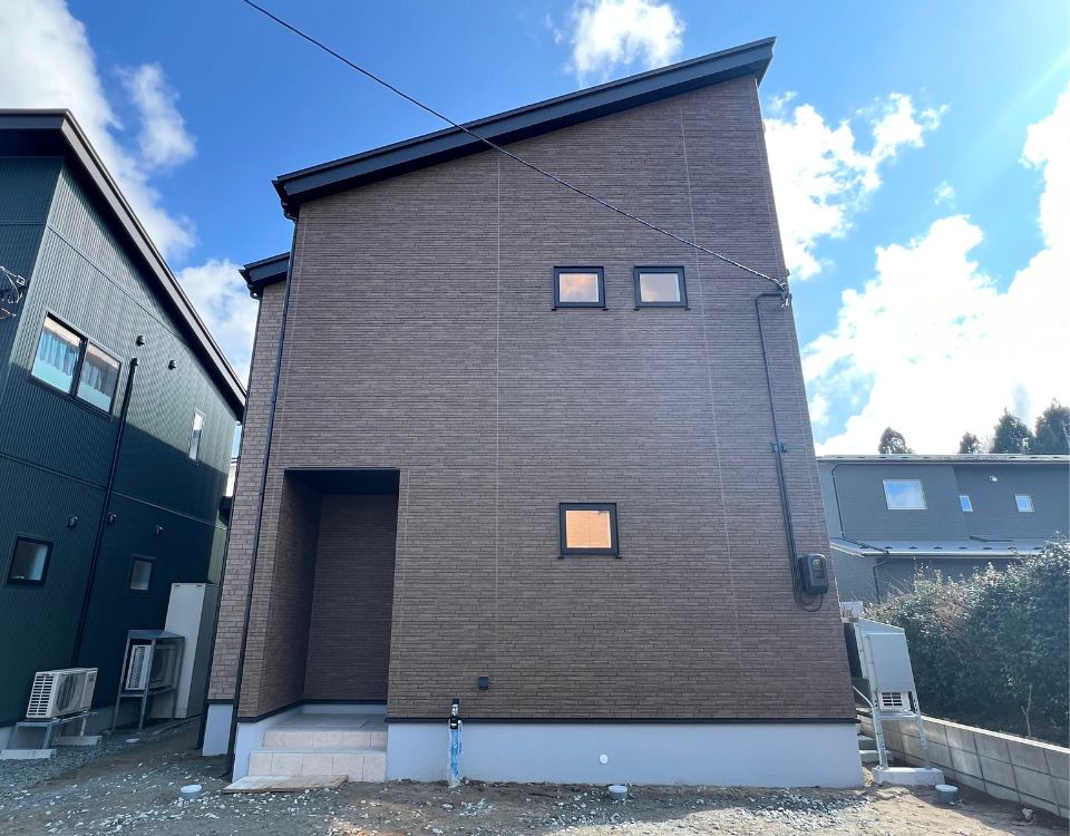ブラウンの外壁でまとめた、落ち着きのあるシンプルな外観の住まい。窓の大きさや位置を工夫することで、室内に光を取り込みながら外からの視線にも配慮しています。また、玄関ポーチを奥に配置することで雨に濡れにくく、使い勝手にも配慮。シンプルながらも暮らしやすさを考えた外観デザインです。