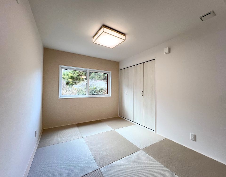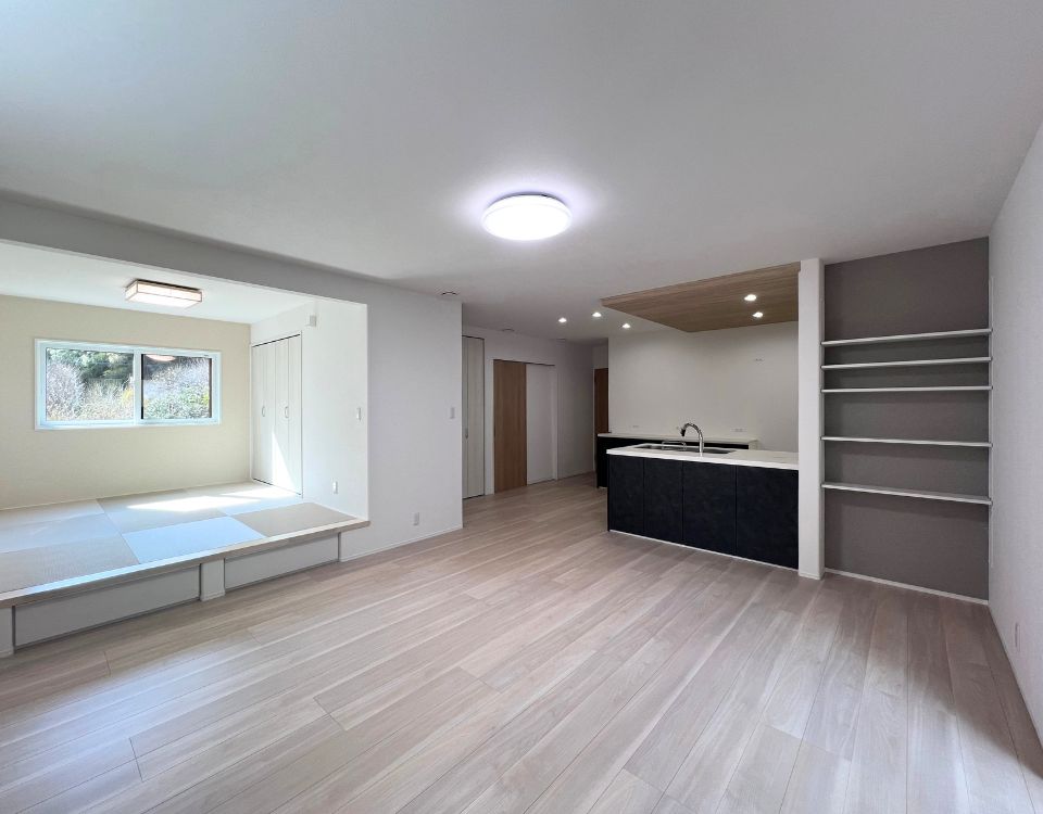 開放感のあるリビングを中心に、家族が自然と集まるLDK。やわらかな光が差し込む空間は、ゆったりとした時間を演出します。小上がりのタタミスペースは、くつろぎや遊び場としても活躍し、暮らしの幅を広げます。キッチンからも全体を見渡せるため、家族とのつながりを感じられる住まいです。