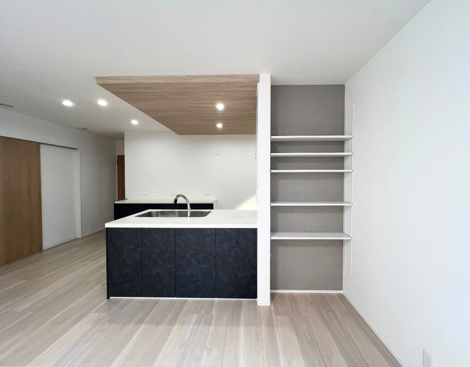 下がり天井が空間にメリハリを与え、落ち着いた色合いのキッチンが上質な印象を演出します。横には可動棚を備えた収納スペースを設け、食品や日用品のストックもすっきり整理できます。リビング収納としても活躍しそうな予感です。