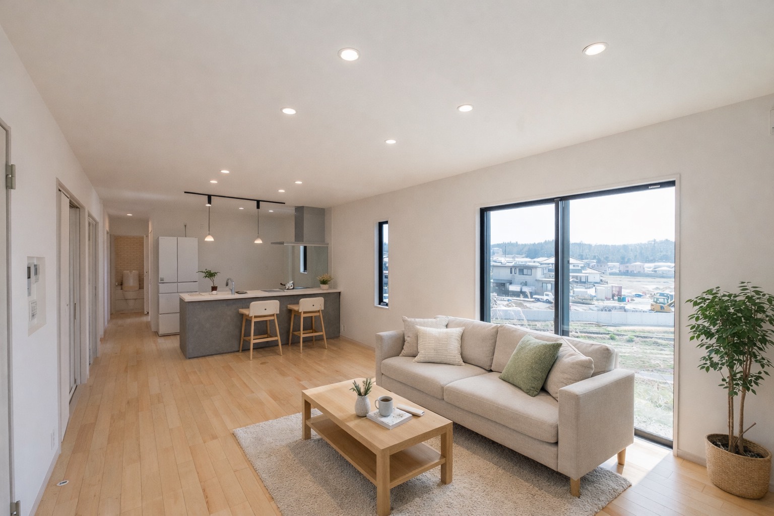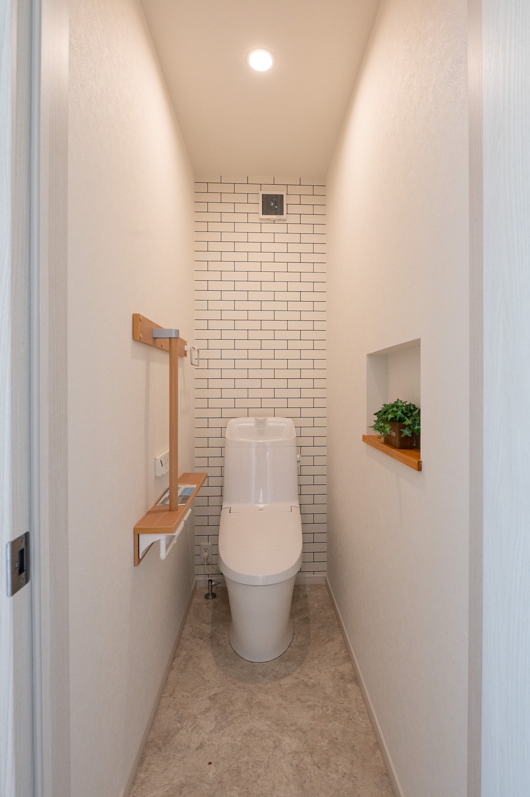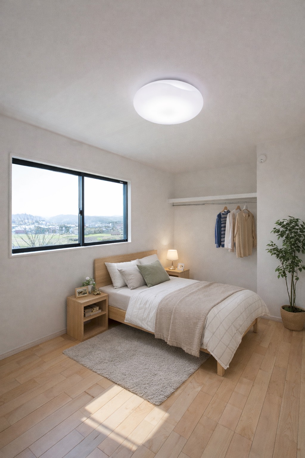 小高い丘を立地としたこの平屋。お子さんが巣立った後に夫婦二人で住むことを考えて建てられました。 玄関を入ると2人暮らしには充分なほどのシューズクローク。和室は玄関からも出入り可能で客間として利用可能。18帖の広いリビングからはこの立地だからこその眺望が広がっています。そこから見える家々や田畑は朝、夕の日で違った景色に見えました。リビングを抜けると、夫婦の寝室、2部屋の洋室。夫婦以外のこの部屋は、お子さんの帰省や将来的なご夫婦の親御さんとの同居を見据えて設計したもの。現在(いま)だけでなく、将来的な生活の変化にも耐えうる考えられた間取となっています。