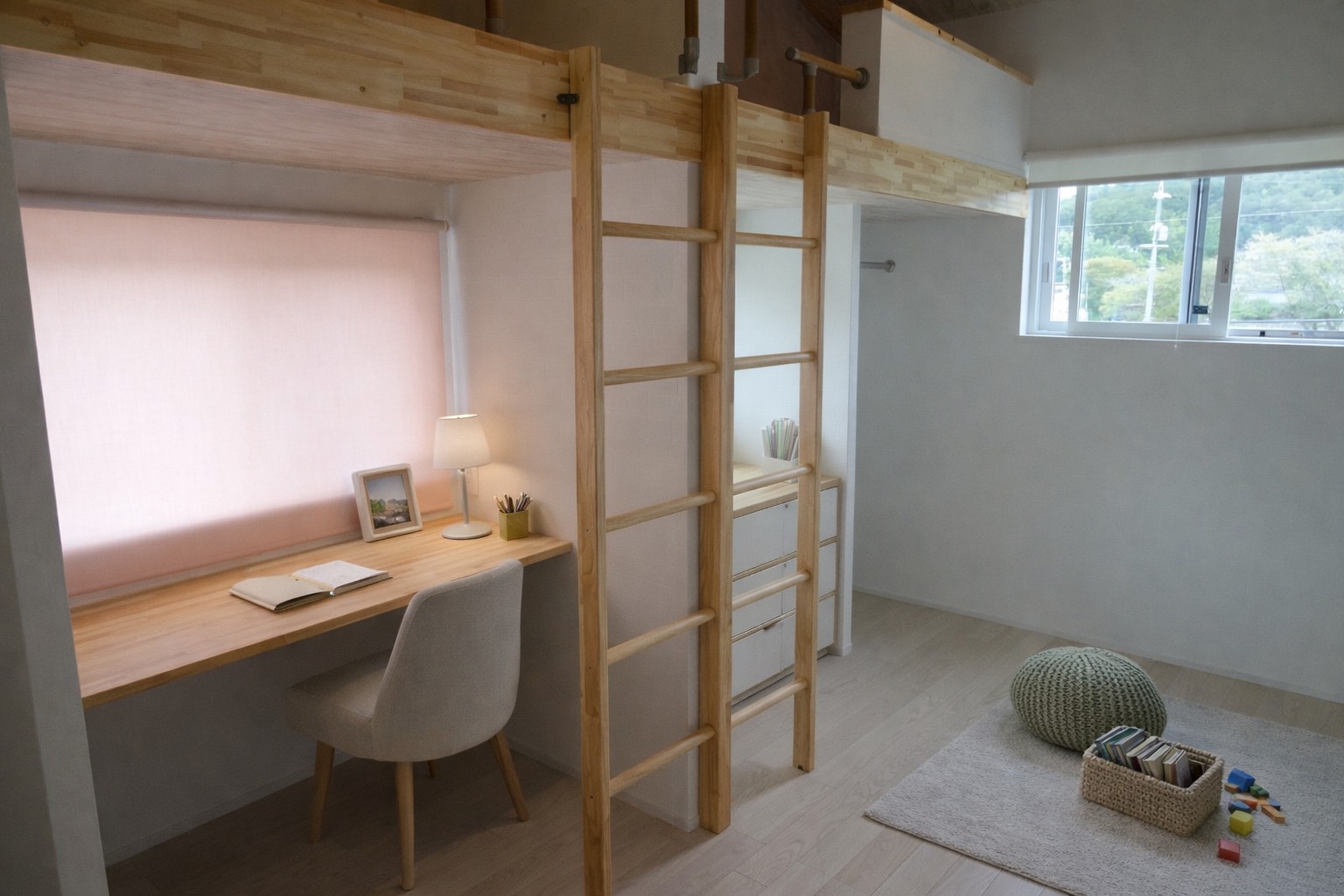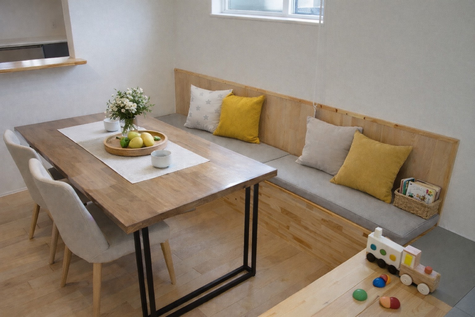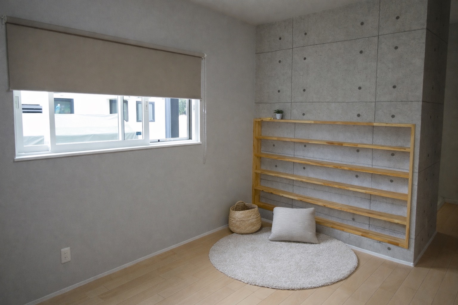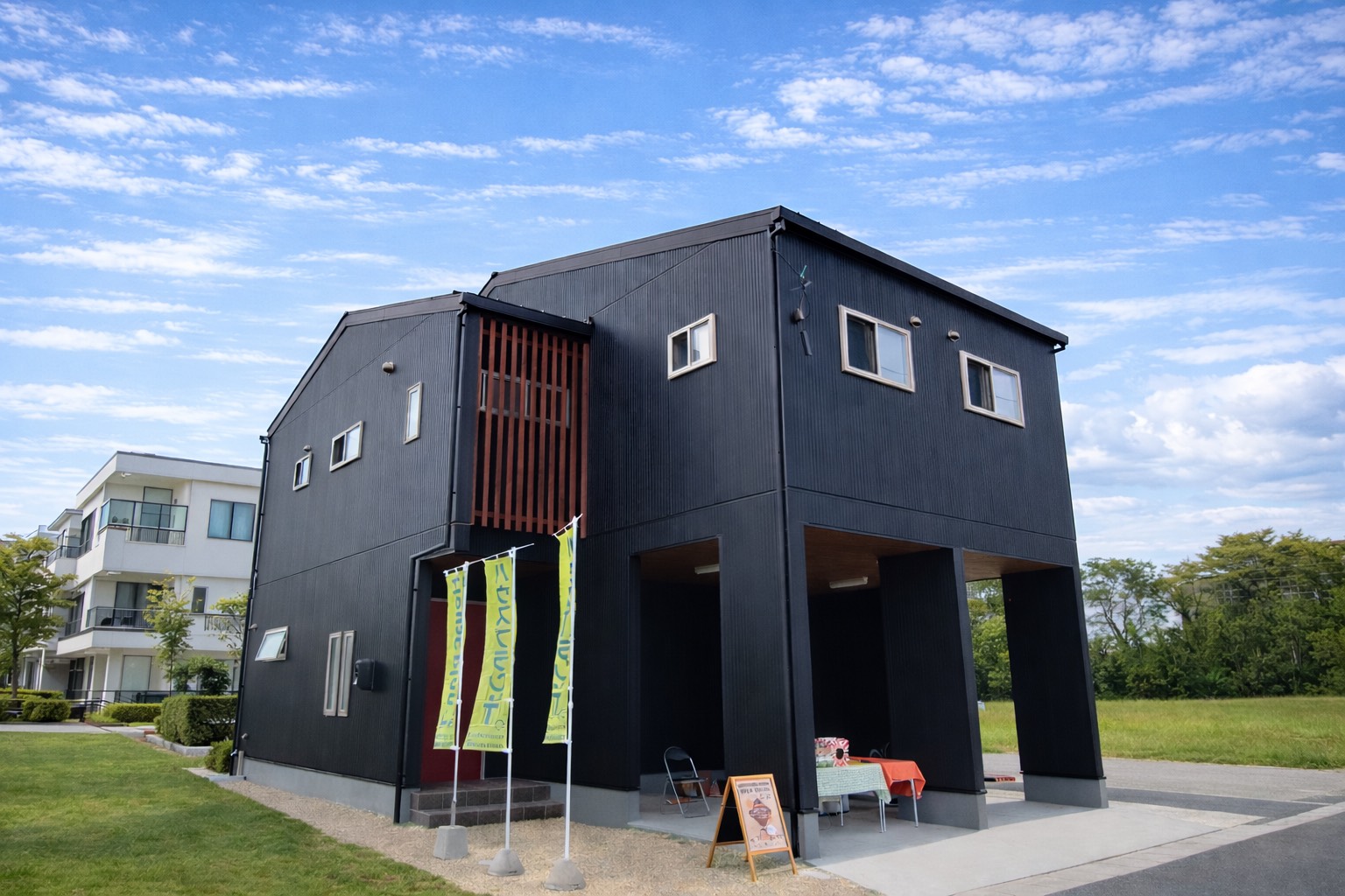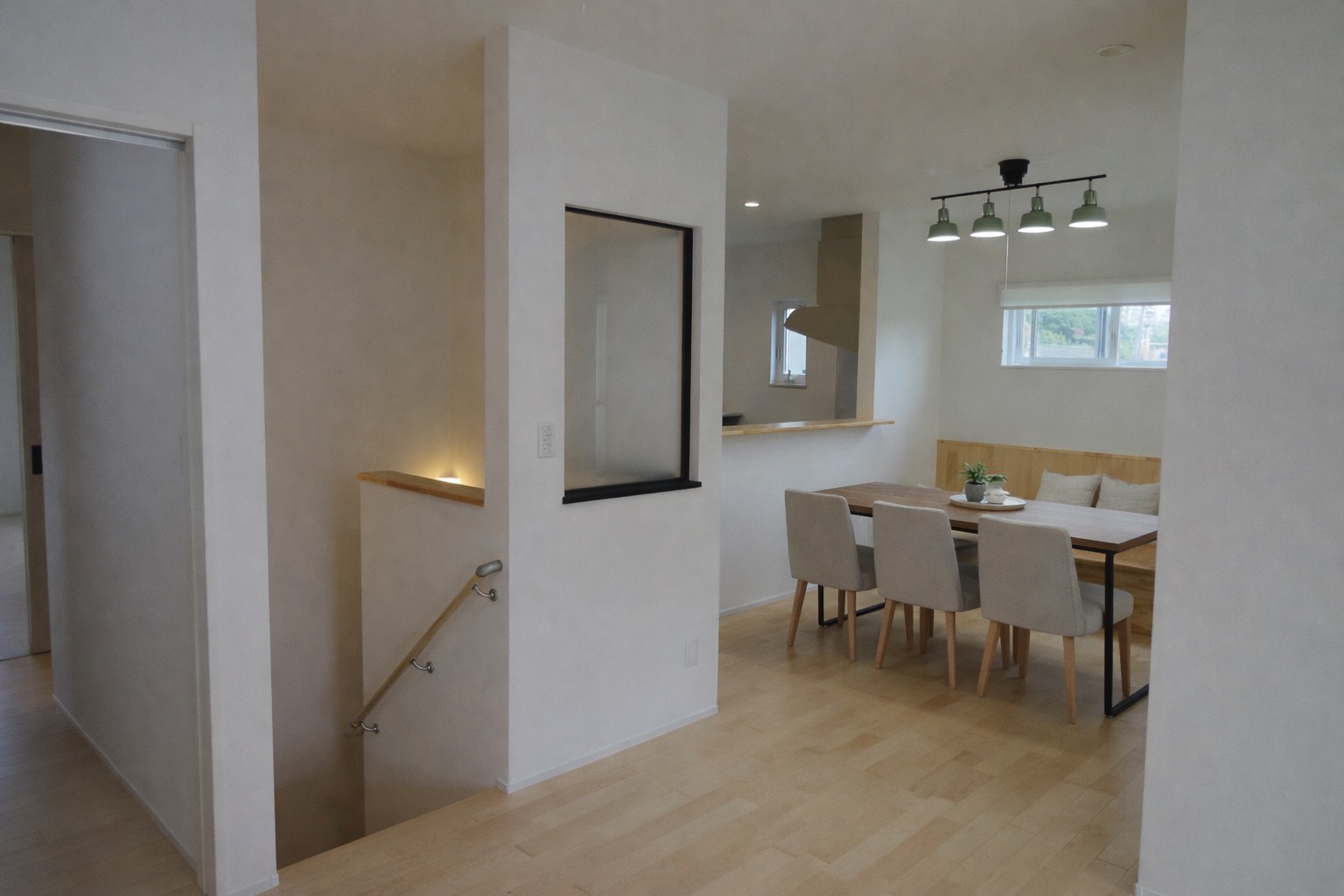 2階にリビングを持ってくることで”プライバシーと開放感”を両立したお家。バルコニーから伸びる長い脚が特徴的ですが、モノトーンにより視覚的にはすっきりとまとまった外観になっています。玄関と並立する2つの車庫は屋外でのバーベキューをするのにも役立てられるようにしました。玄関を入ると明るい木目がアクセントとなったホール。ニッチに設けられた間接照明は飾るものをきれいに際立たせます。手洗い器も”ただいま”からすぐに汚れを落とせるようにホールを出てすぐに設置しました。階段を上がると家族の待つリビングへ。日当たりを邪魔されない明るさ、バルコニーへの開放性。広い窓で開放的な明るい見晴らしをつくりながらも、プライバシーを守ることができています。広いバルコニーとリビングへの行き来はこのお家ならではといっても良いのではないでしょうか。