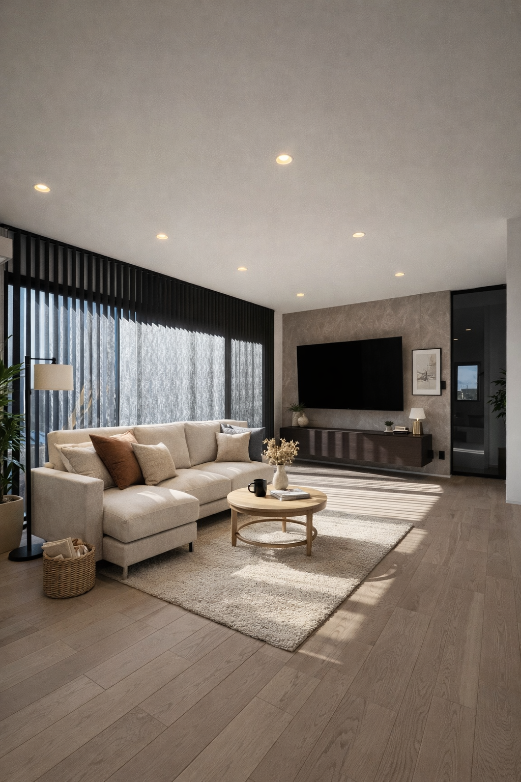 やわらかな光と素材感が調和した、ホテルライクなリビング空間。