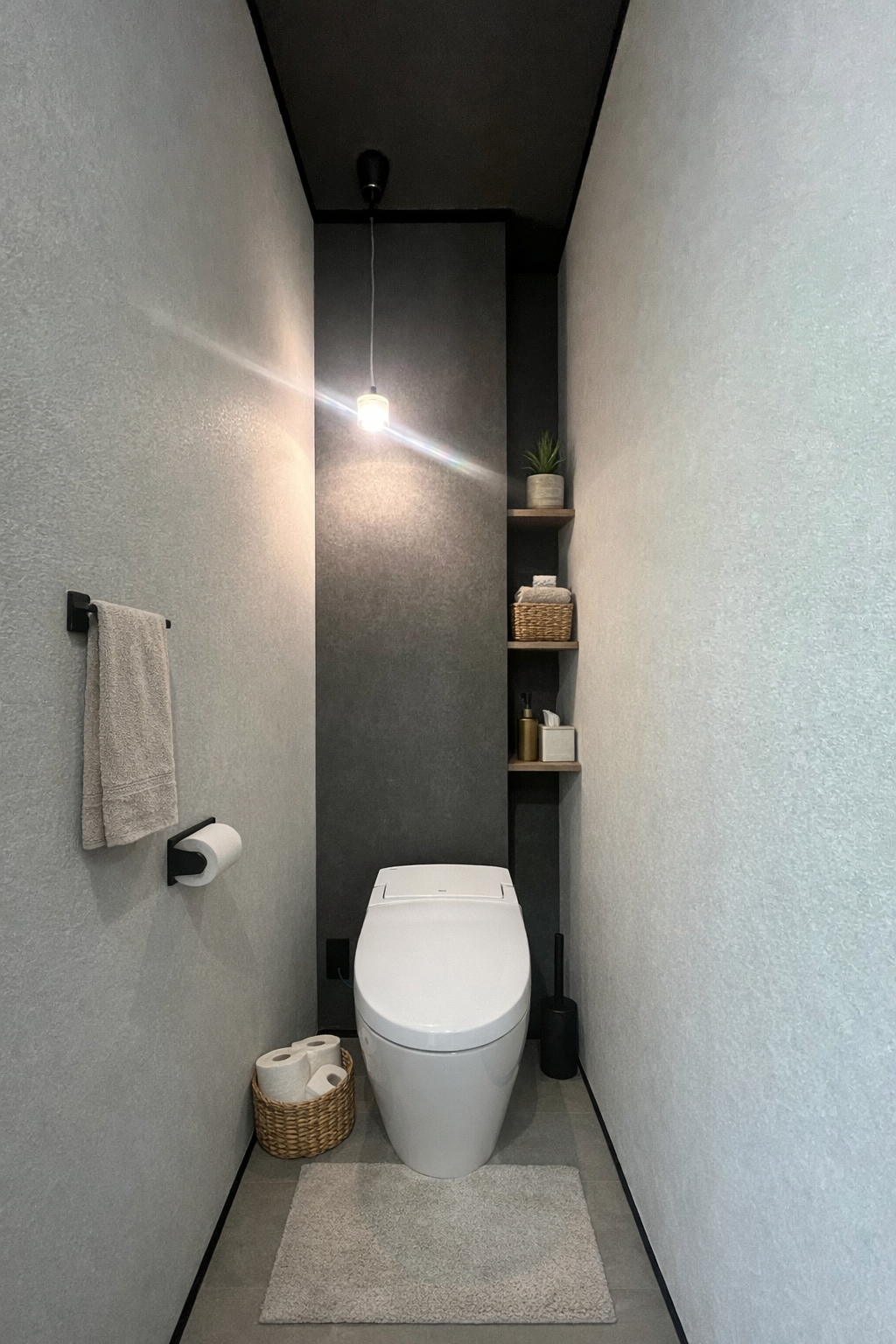 陰影の美しい照明が印象的な、上質感のあるトイレ空間。