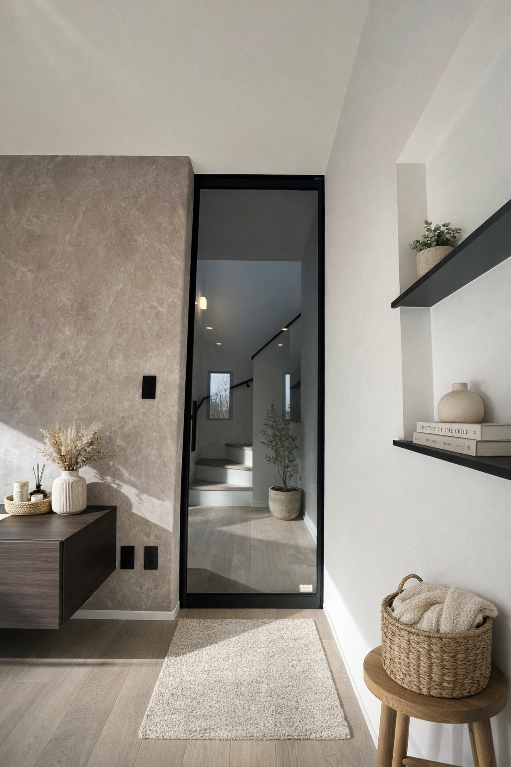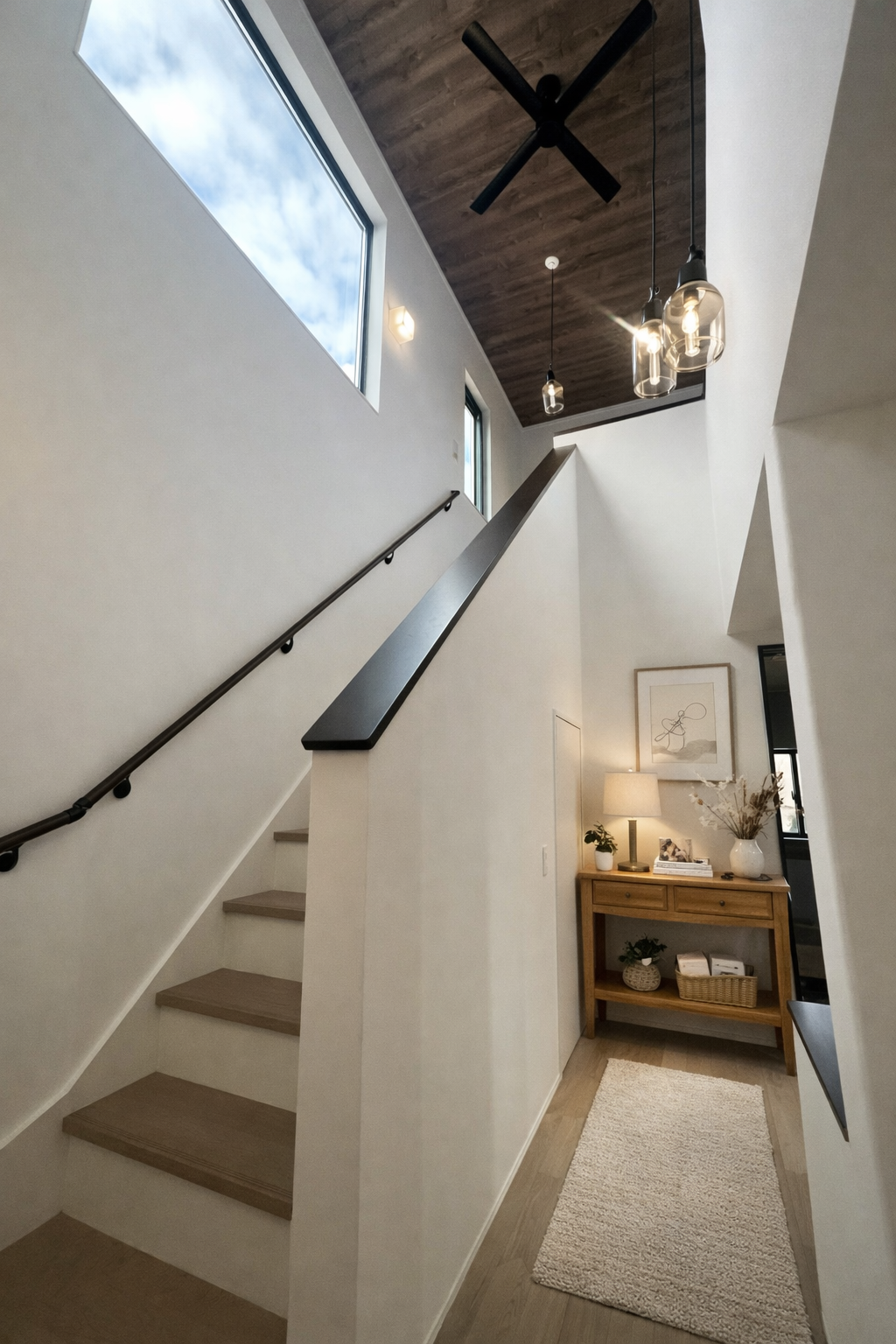 吹抜けの開放感と光が心地よい、上質な階段スペース。