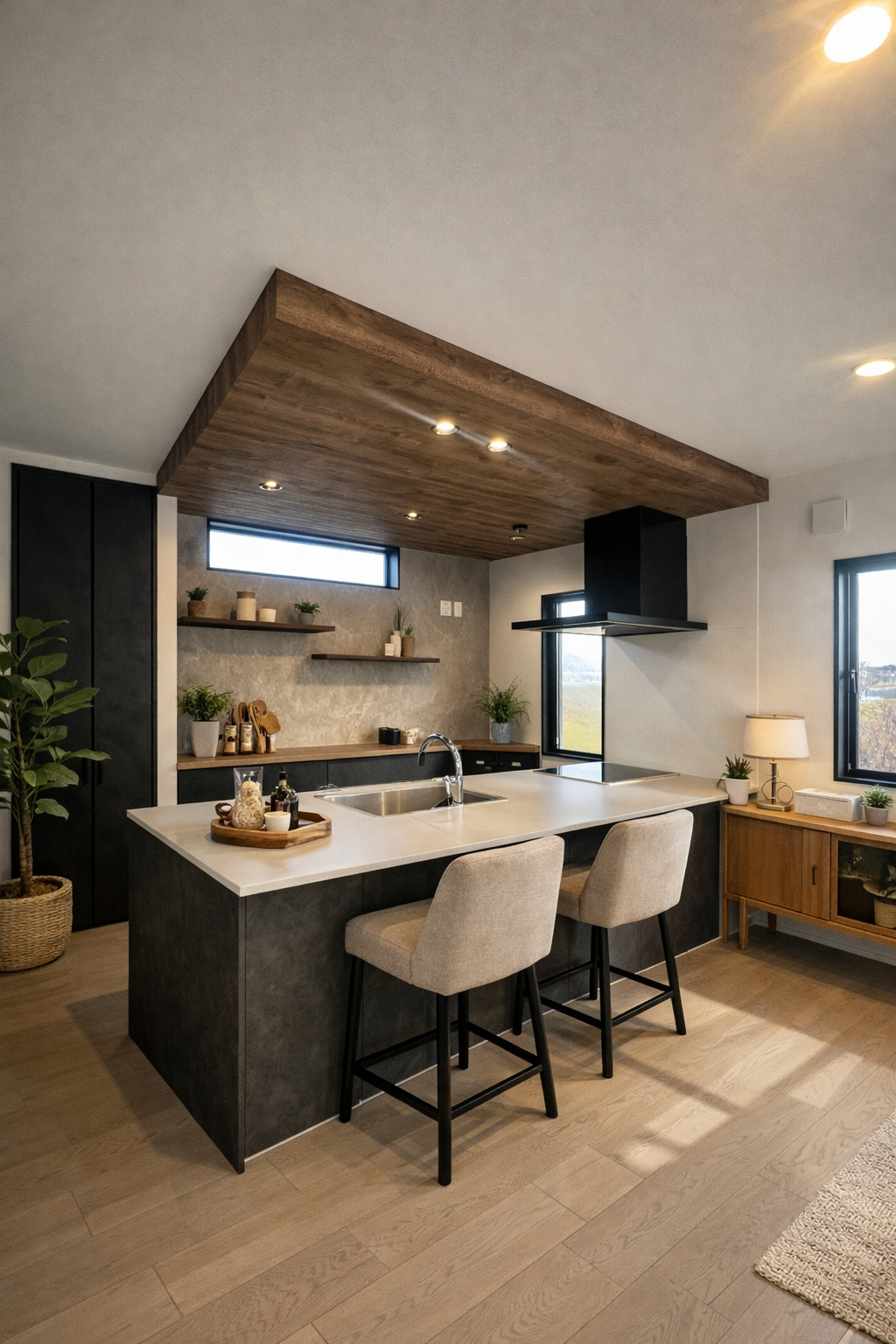 木目天井が空間を引き締める、デザイン性の高いキッチン。