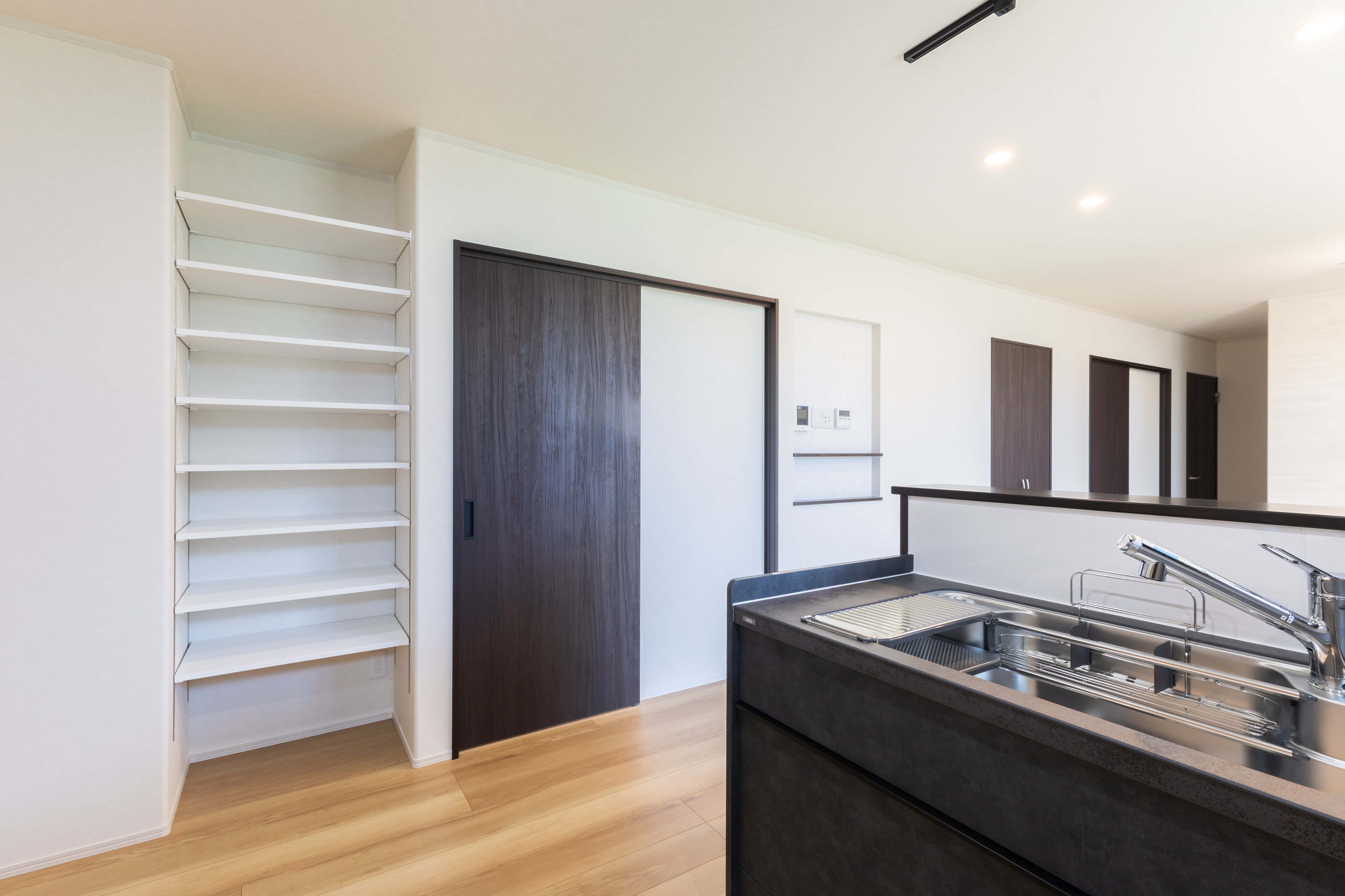 キッチン横の可動棚は、使い勝手の良いパントリーとして活躍します。