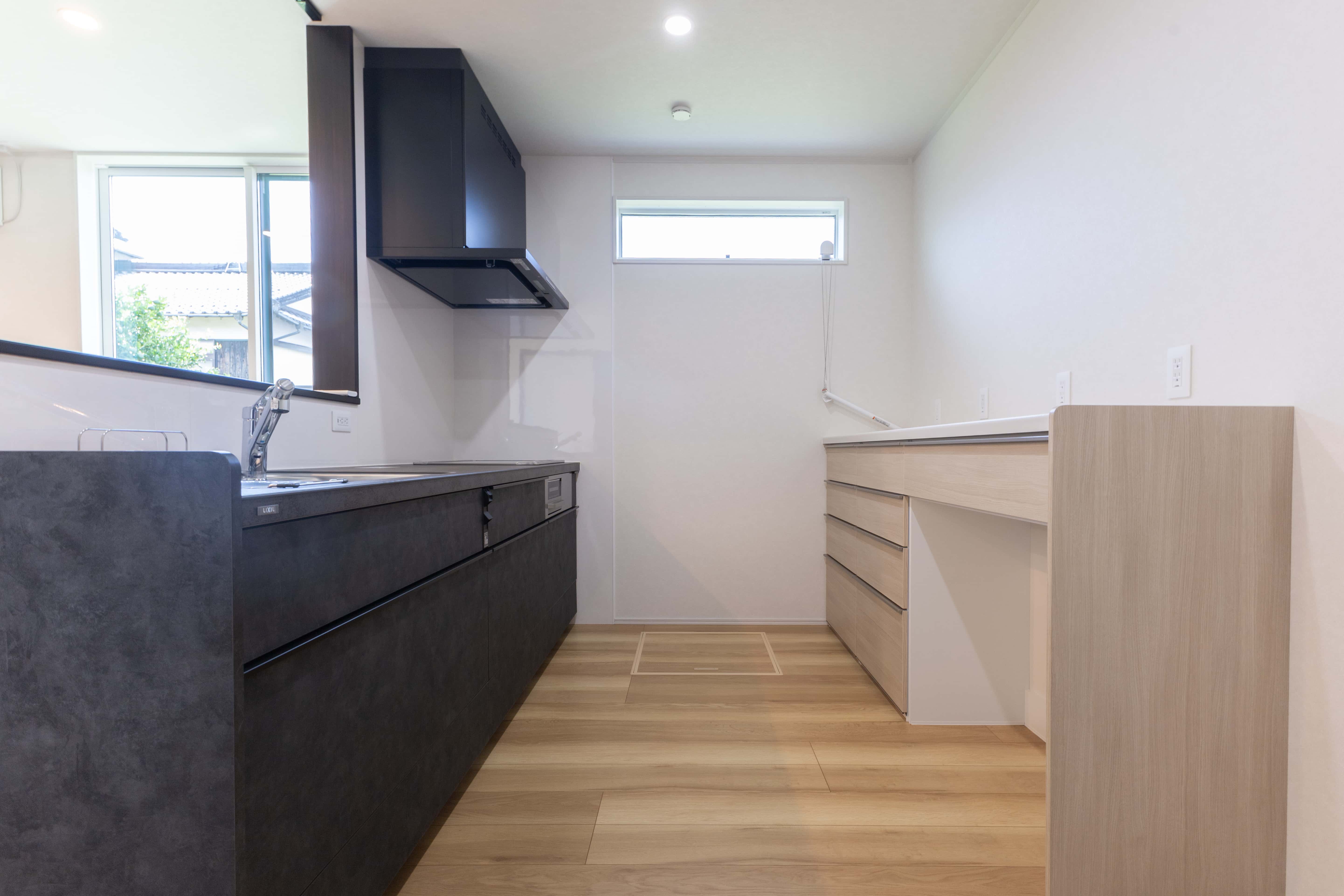キッチンは「LIXIL リシェル/色:グレージュスタッコ」を採用。キッチンファニチャーは「LIXIL ノクト/カウンターカラー:クリエモカ」を採用しました。