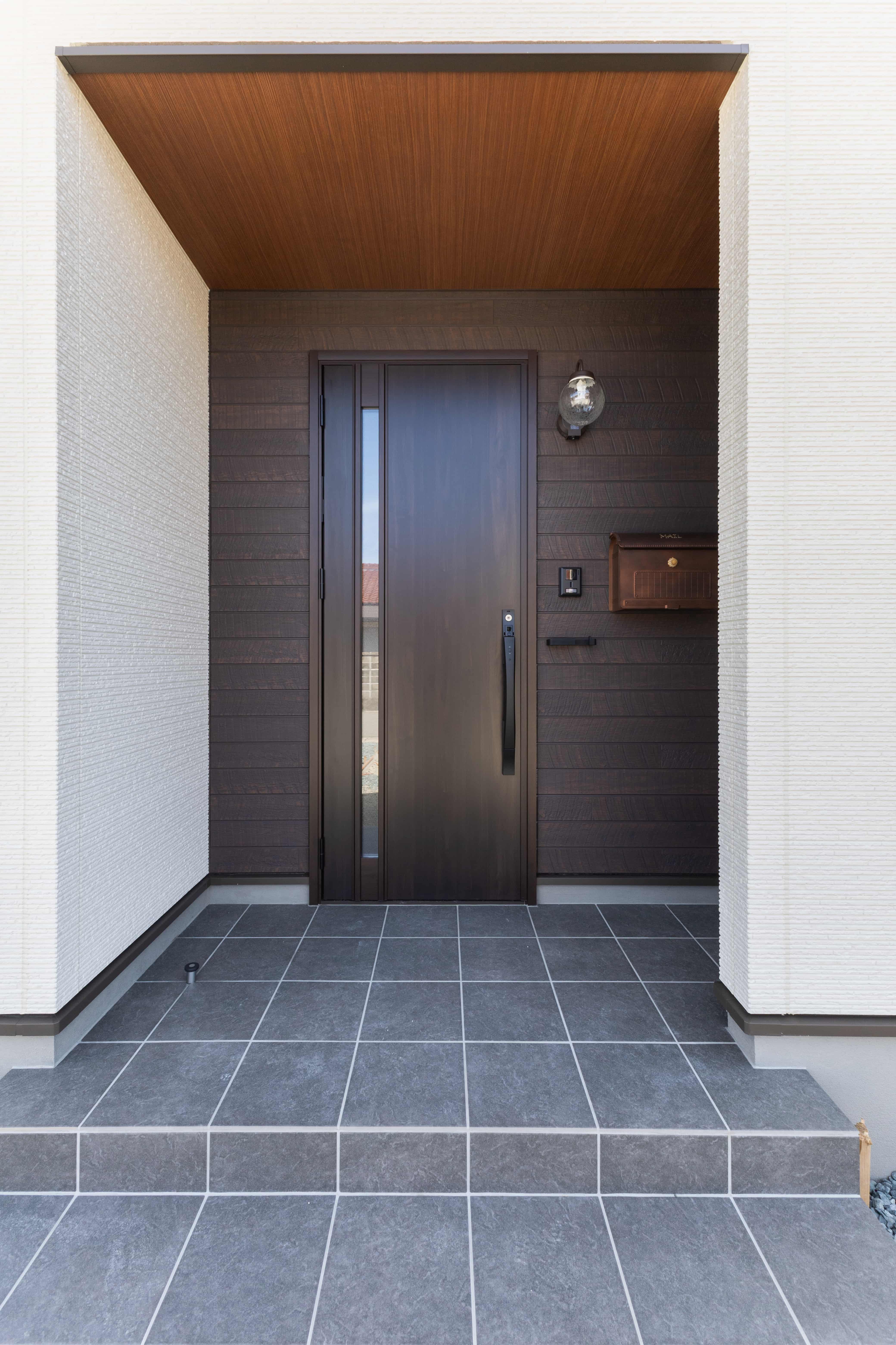 ベースの外壁は「ニチハ アフェットプレミアム/色:プリミエMGホワイト」を採用、玄関部分のアクセント外壁には「ニチハ キャスティングウッドプレミアム/色:ダークブラウン」を合わせ、シンプルながらも帰りたくなる暖かみのある外観に。
