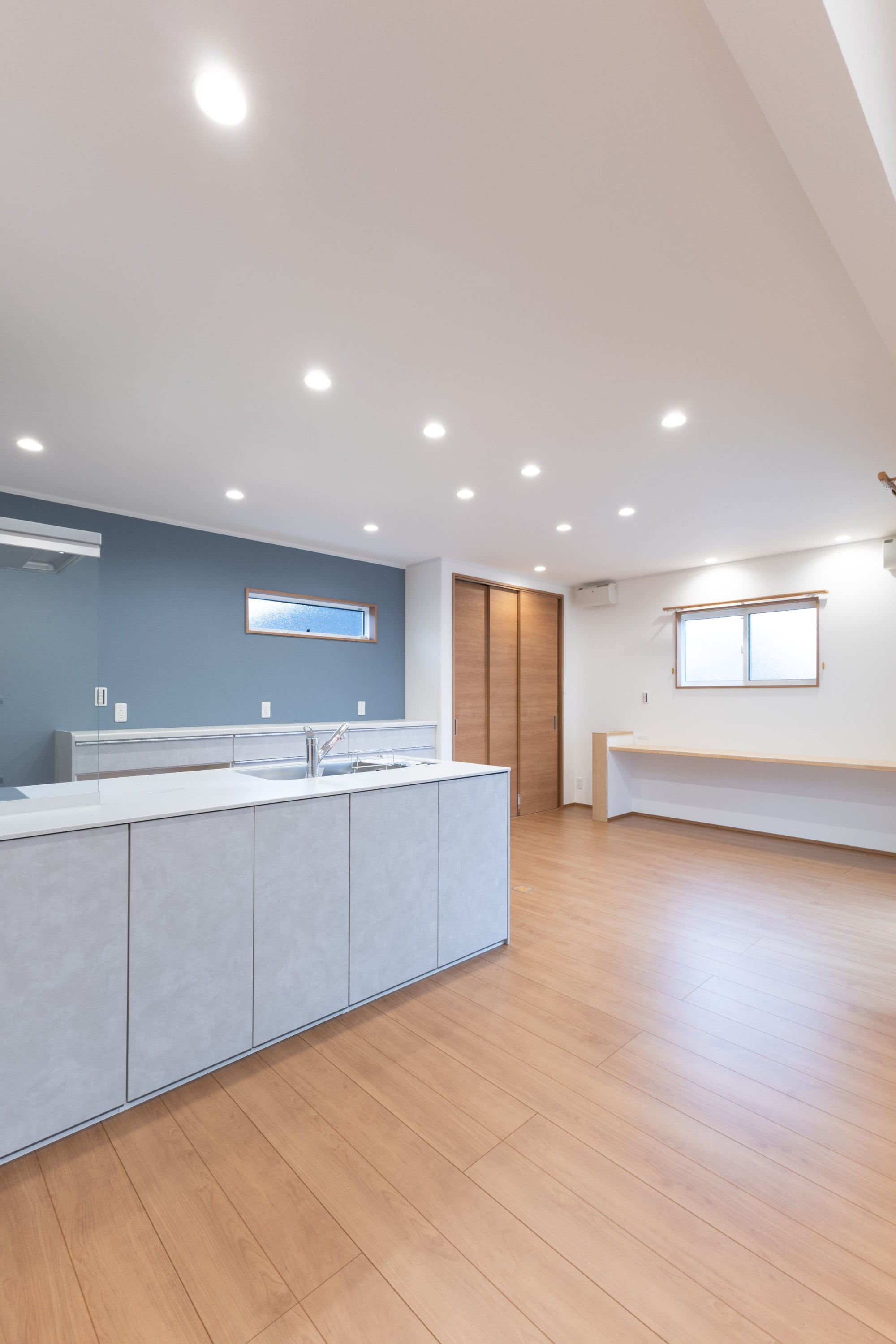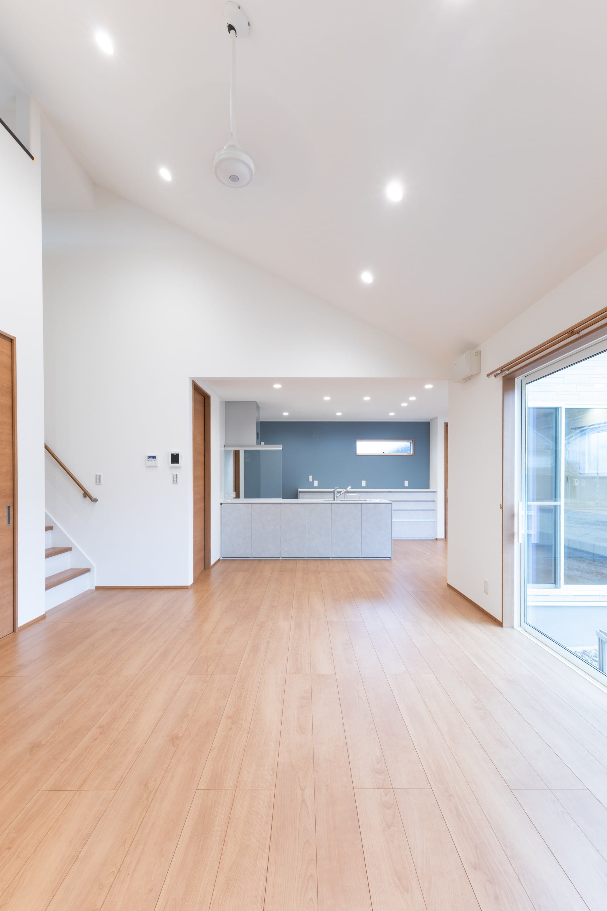 約21.5帖のゆとりあるLDK。勾配天井で、家族が自然と集まる開放的な空間に仕上げました。