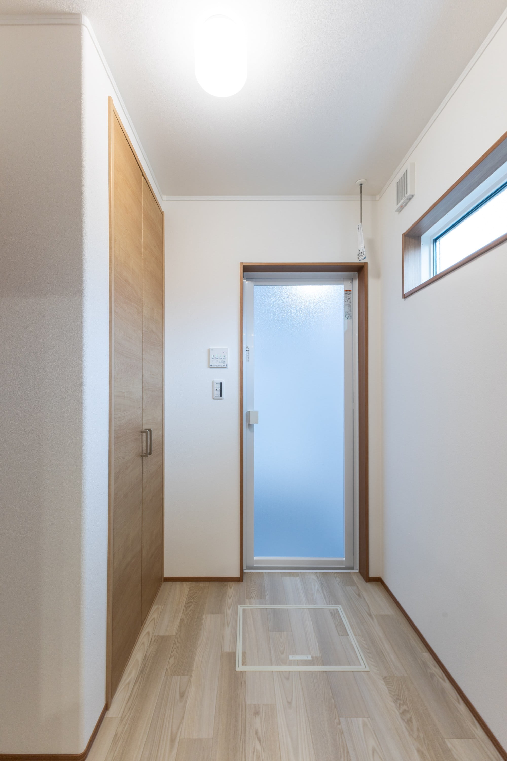 脱衣ランドリー室。室内干しができるようホスクリーンを設置し、よく使うものを収納できる収納スペースも備えました。