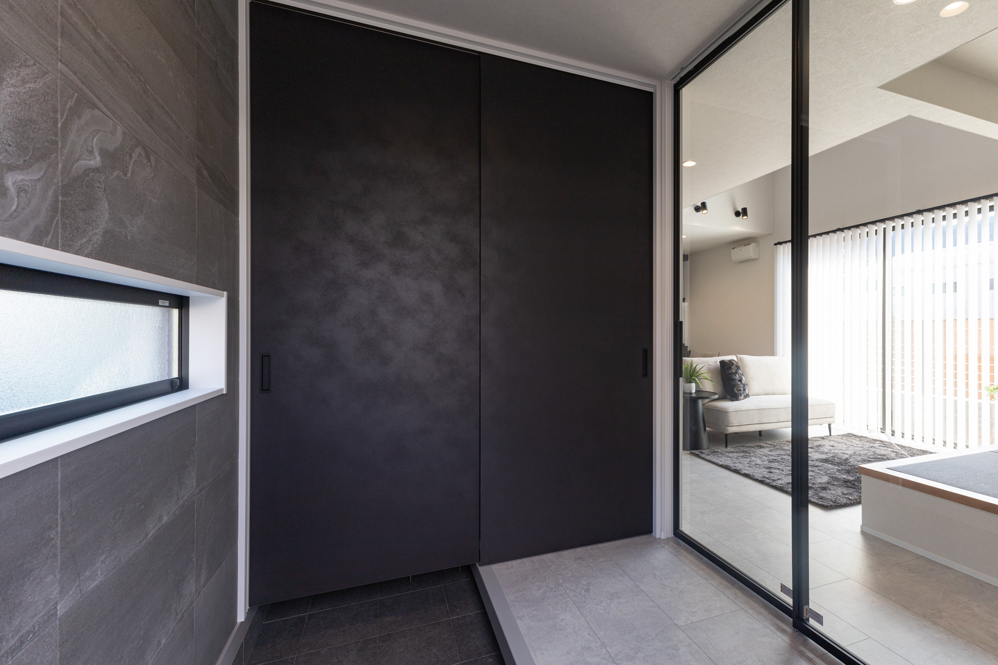 玄関ホールには土間収納を設け、リビングドアにはLIXIL「ラフィス」を採用。透明ガラスにすることで、明るいリビングの光が玄関側にも入ります。