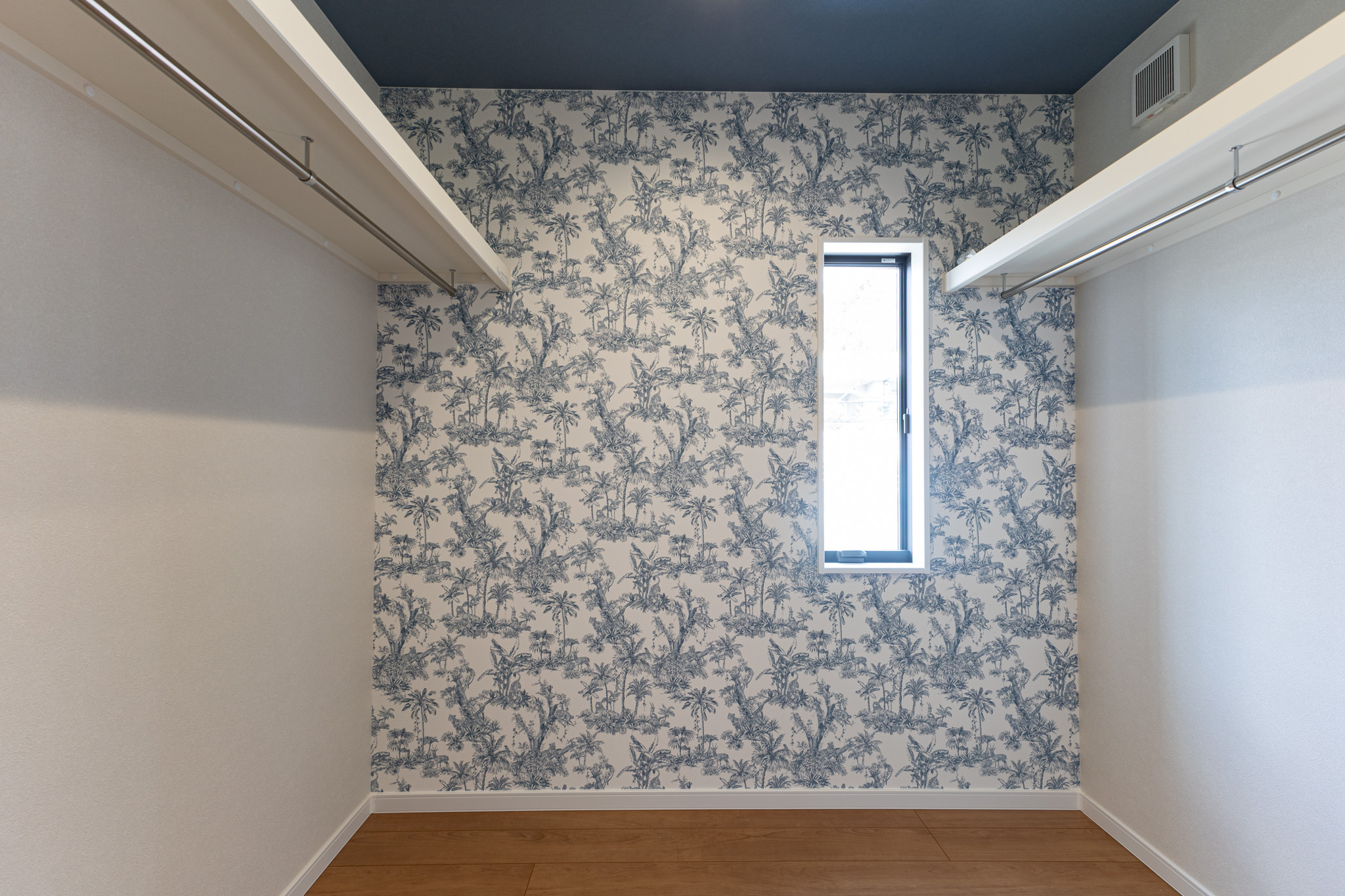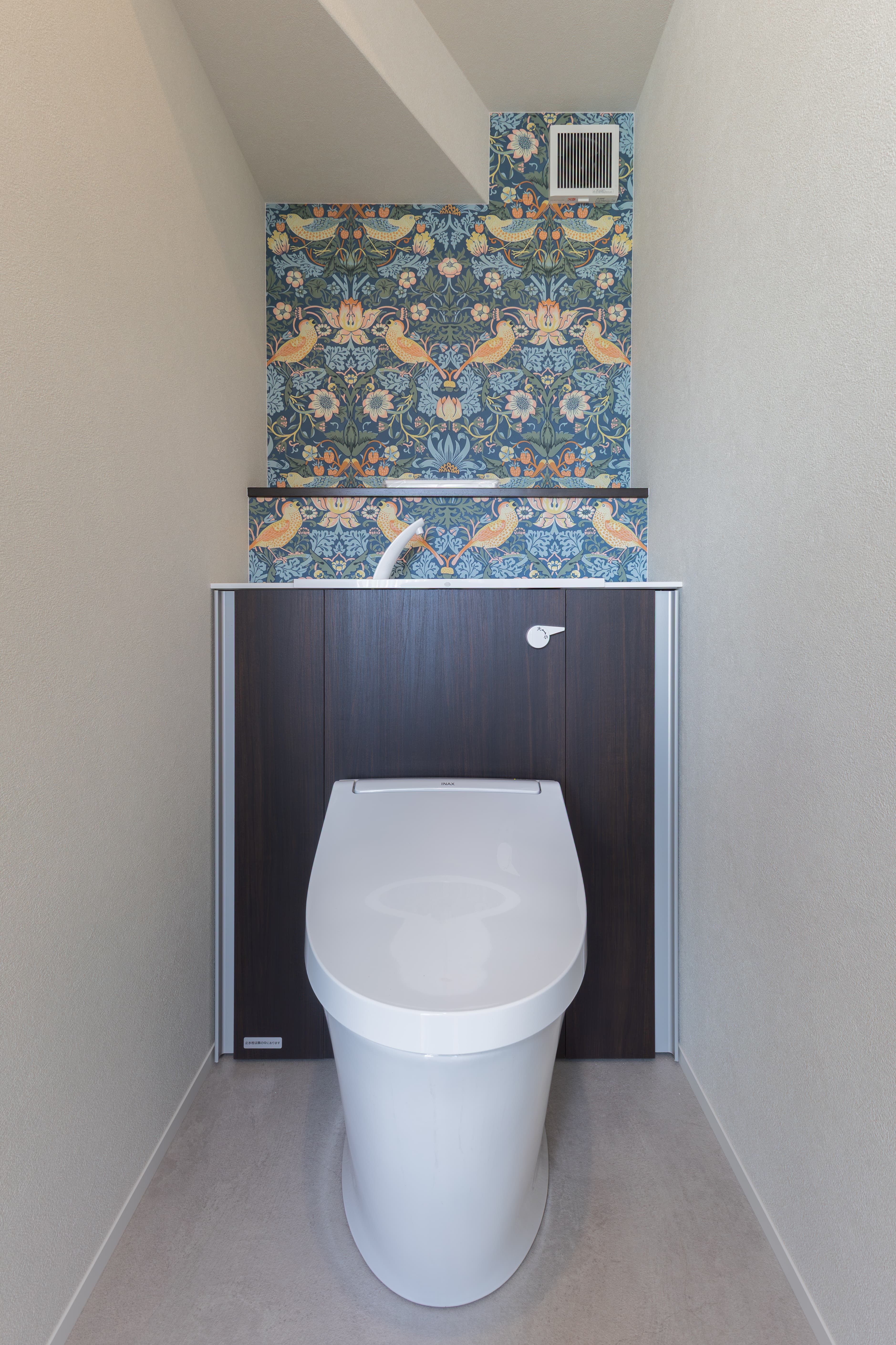 1Fトイレ。LIXIL「ベーシアピタ」のトイレに、ウィリアム・モリス「いちご泥棒」のアクセントクロスを合わせました。
