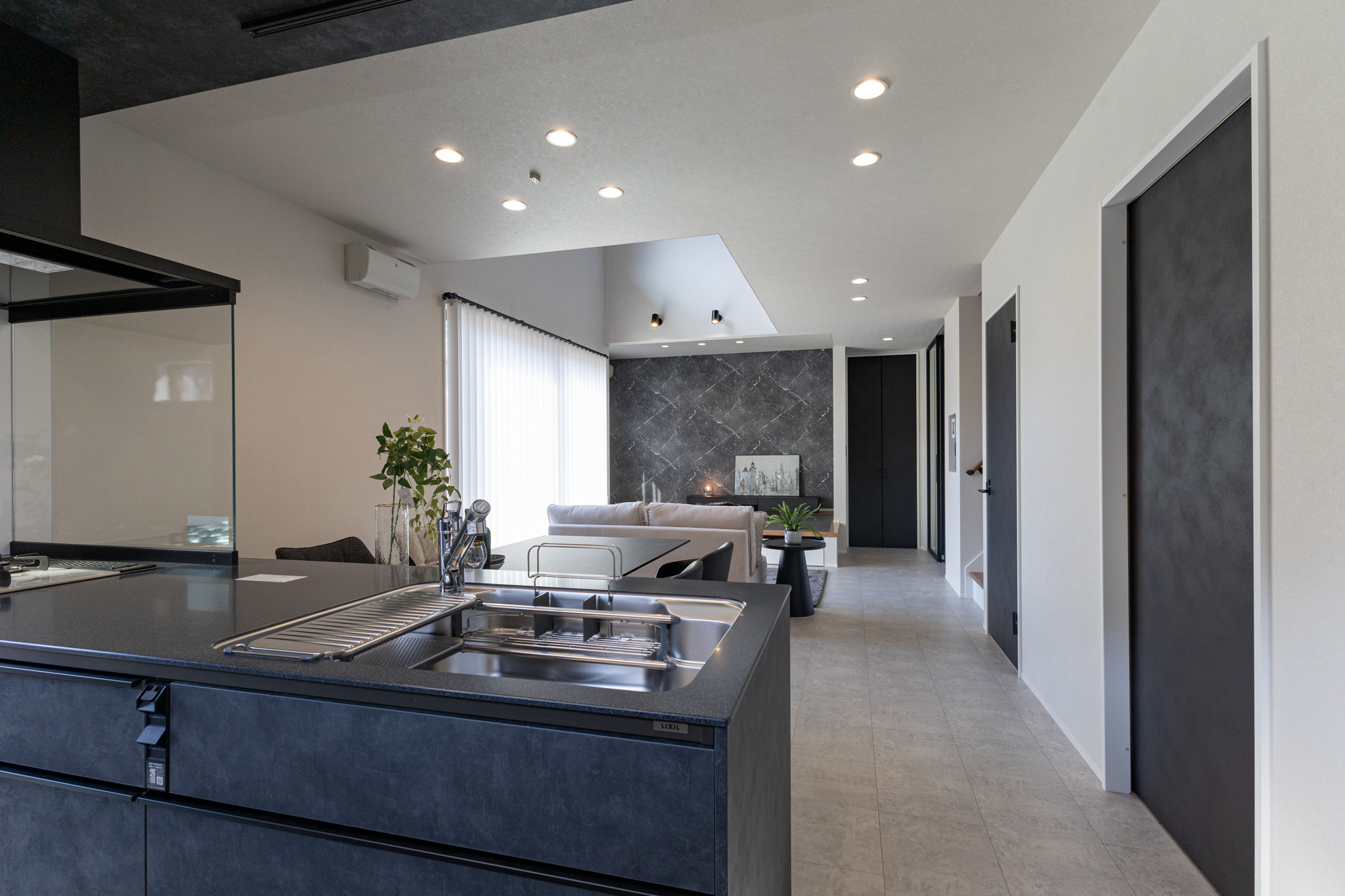 キッチン越しにリビングが見渡せる設計で、家族の様子を感じられます。