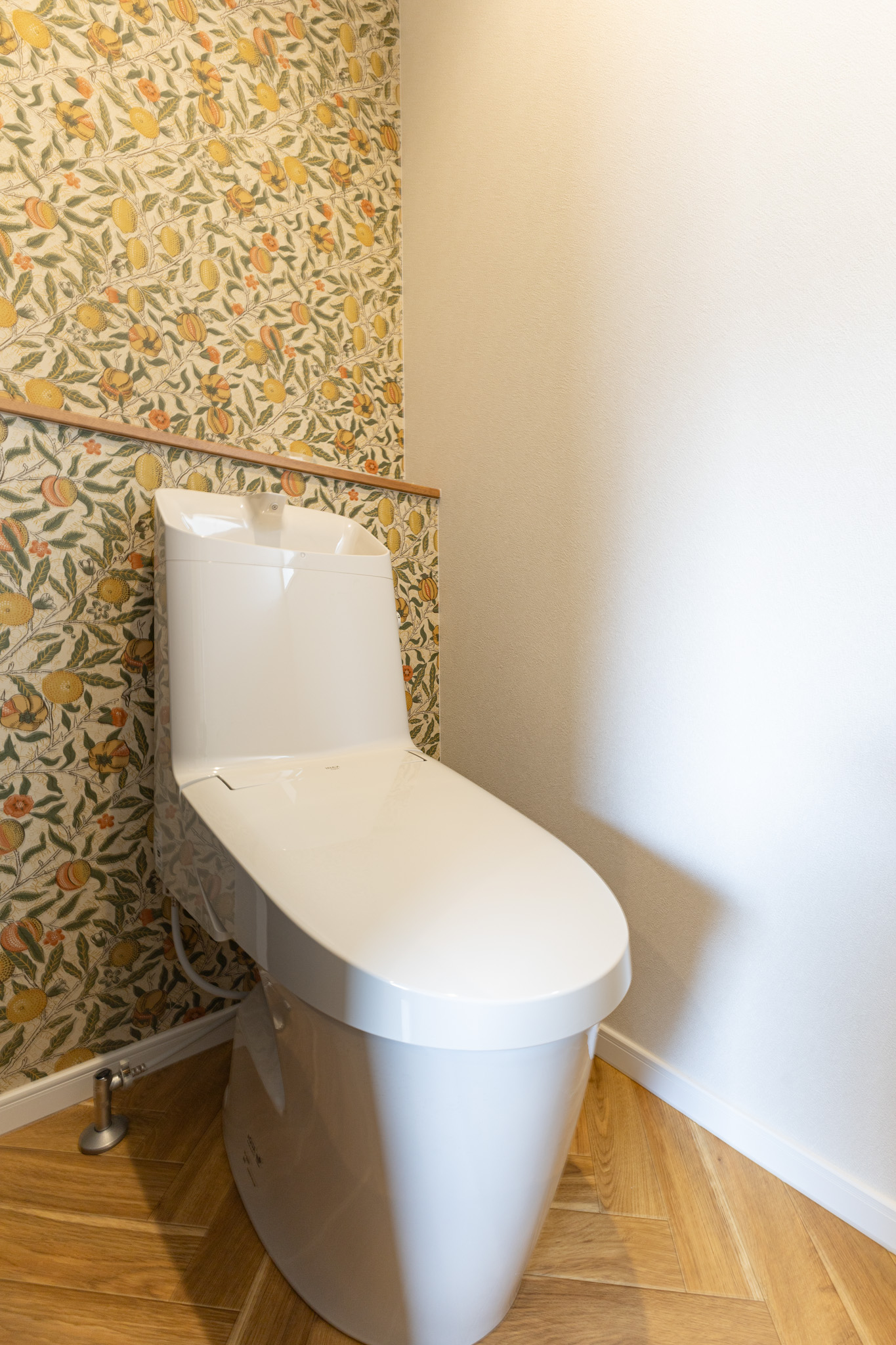 2Fトイレ。LIXIL「ベーシアシャワートイレ」に、ウィリアム・モリス「フルーツ」のアクセントクロスを合わせた上品なトイレ空間。
