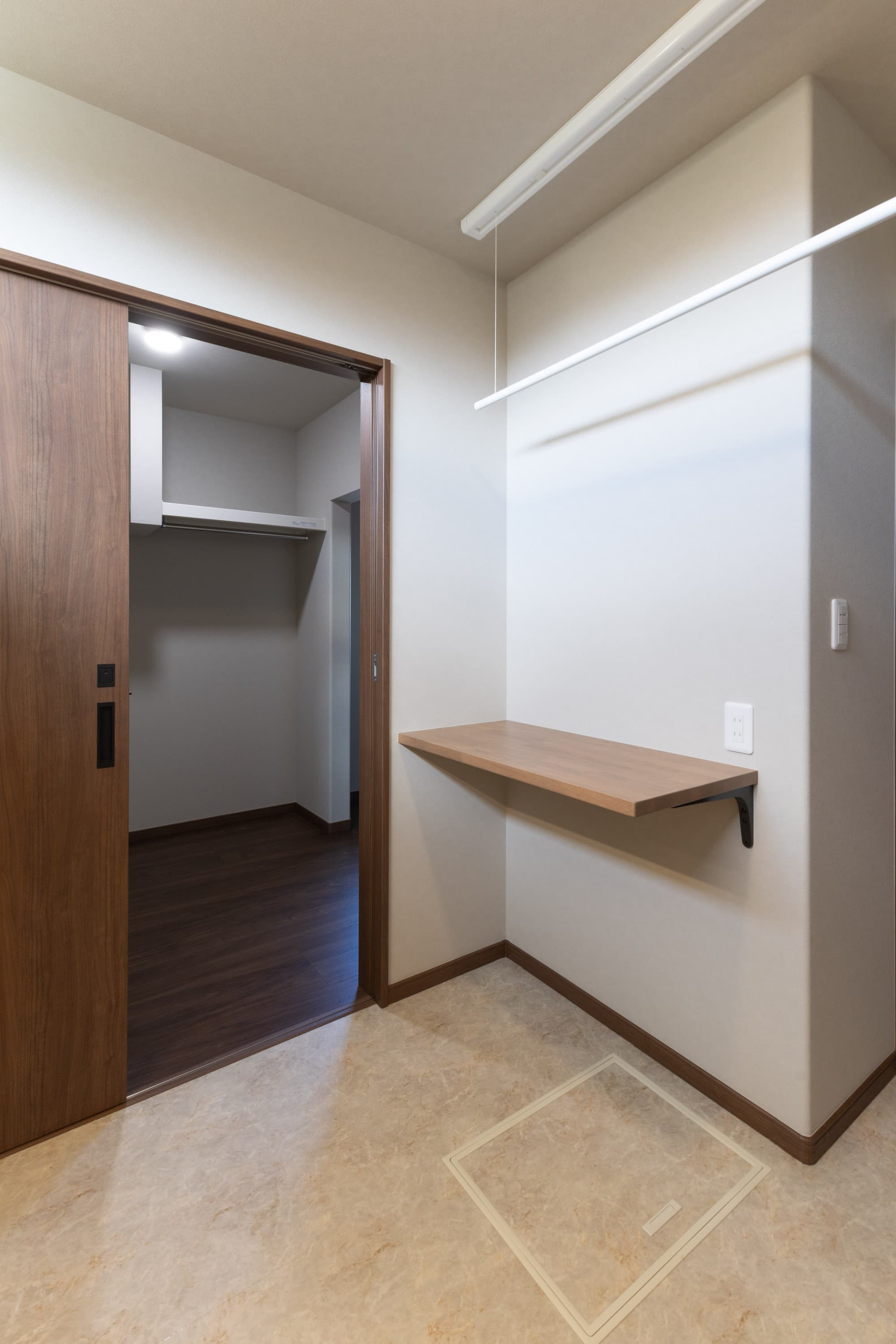 ランドリーには、室内干し用のホスクリーンとカウンターを設置。「洗う→干す→畳む」が一部屋で完結し、隣の収納へすぐしまえる家事ラク動線です。
