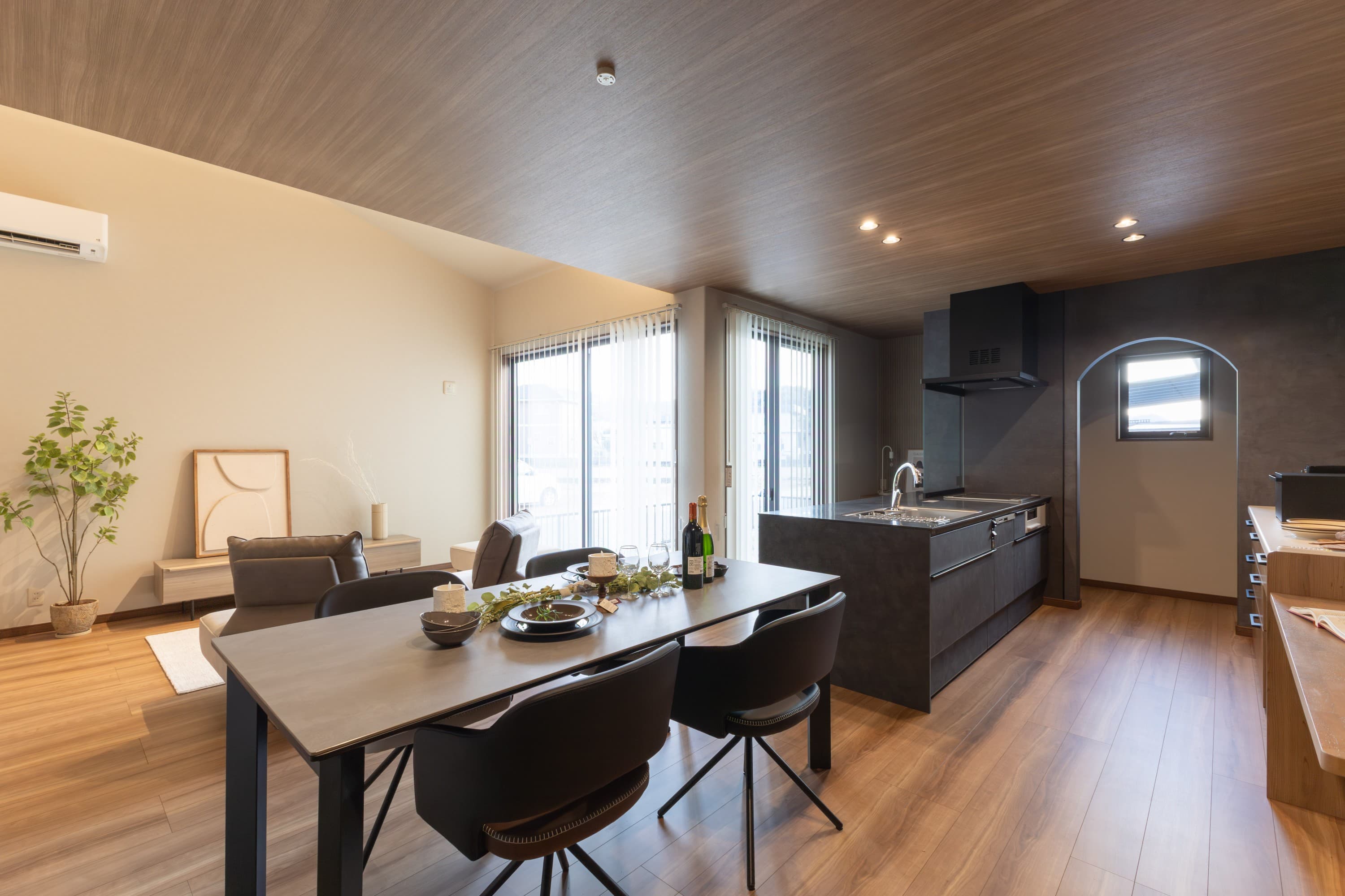 LDK全体は約20.5帖。L字型の間取りに二方向の掃き出し窓を設け、明るく開放的な空間に仕上げました。
