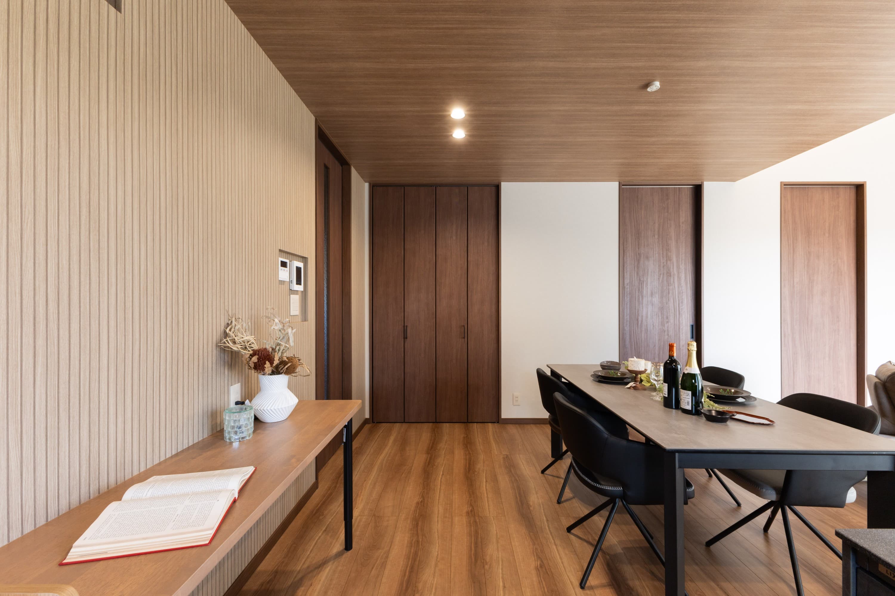 ダイニングテーブルの背面には、約1.5mのカウンターを設置。ちょっとした作業スペースとして活躍します。