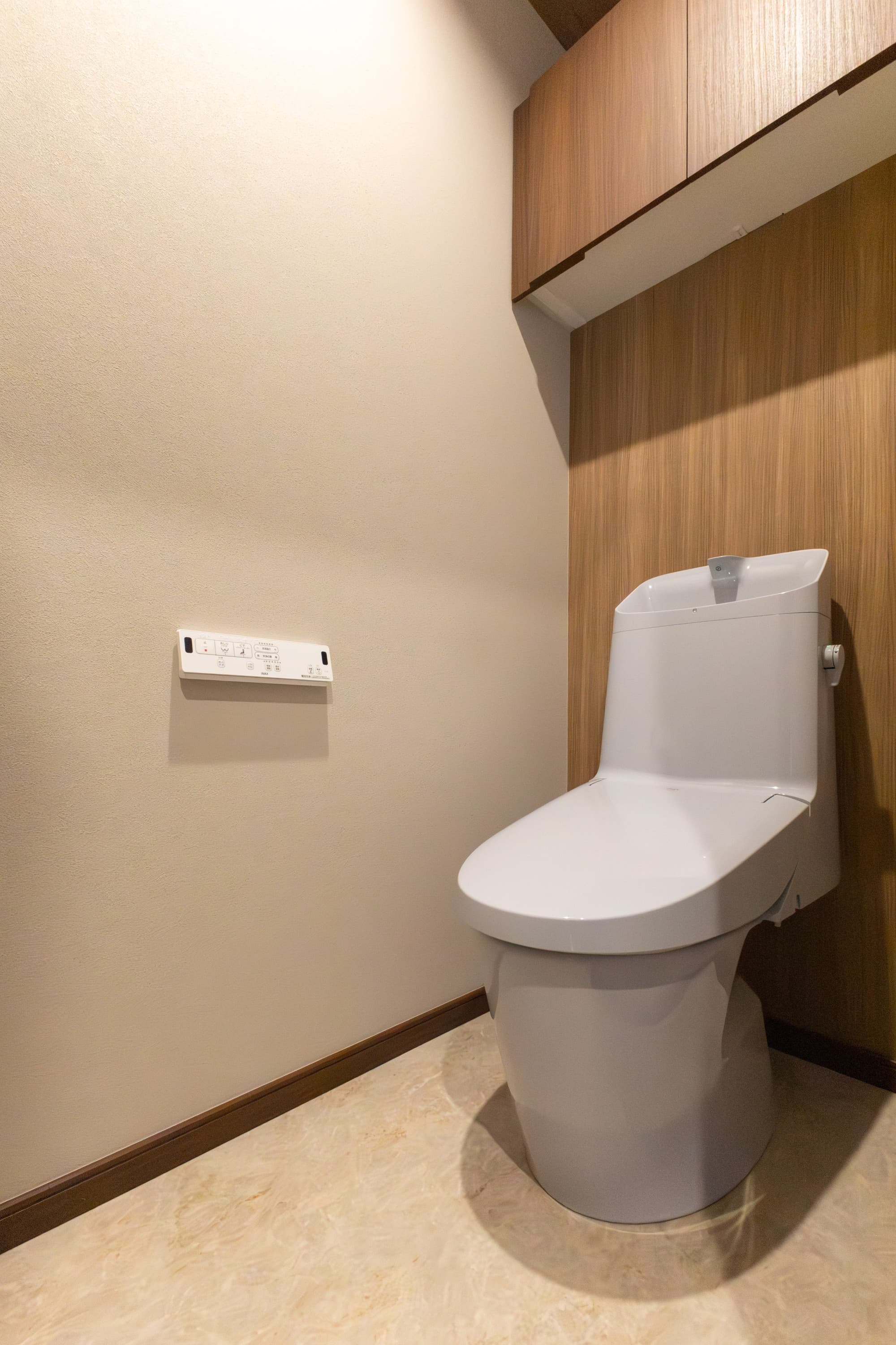 トイレは「LIXIL ベーシアフチレス/色:ブルーグレー」を採用。トイレットペーパーなどを収納できるようにアッパーキャビネットを設けました。