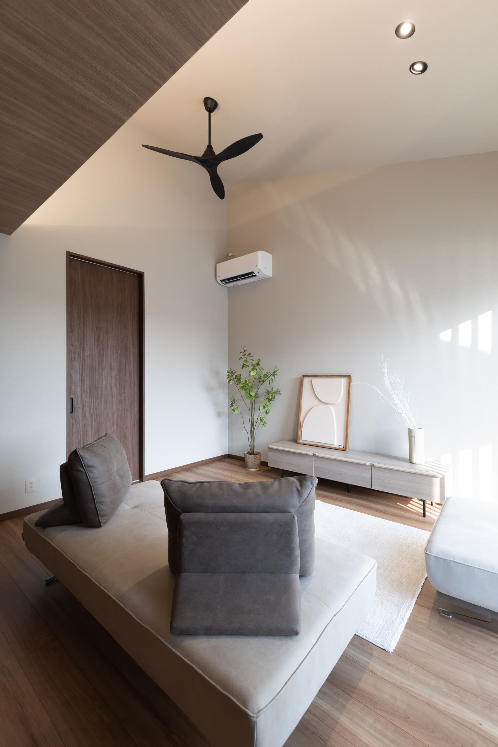 リビングは勾配天井を採用。高い位置に設置したエアコンに合わせてファンを設け、空気が循環しやすい工夫を施しました。照明は角度調整ができるタイプを採用しています。