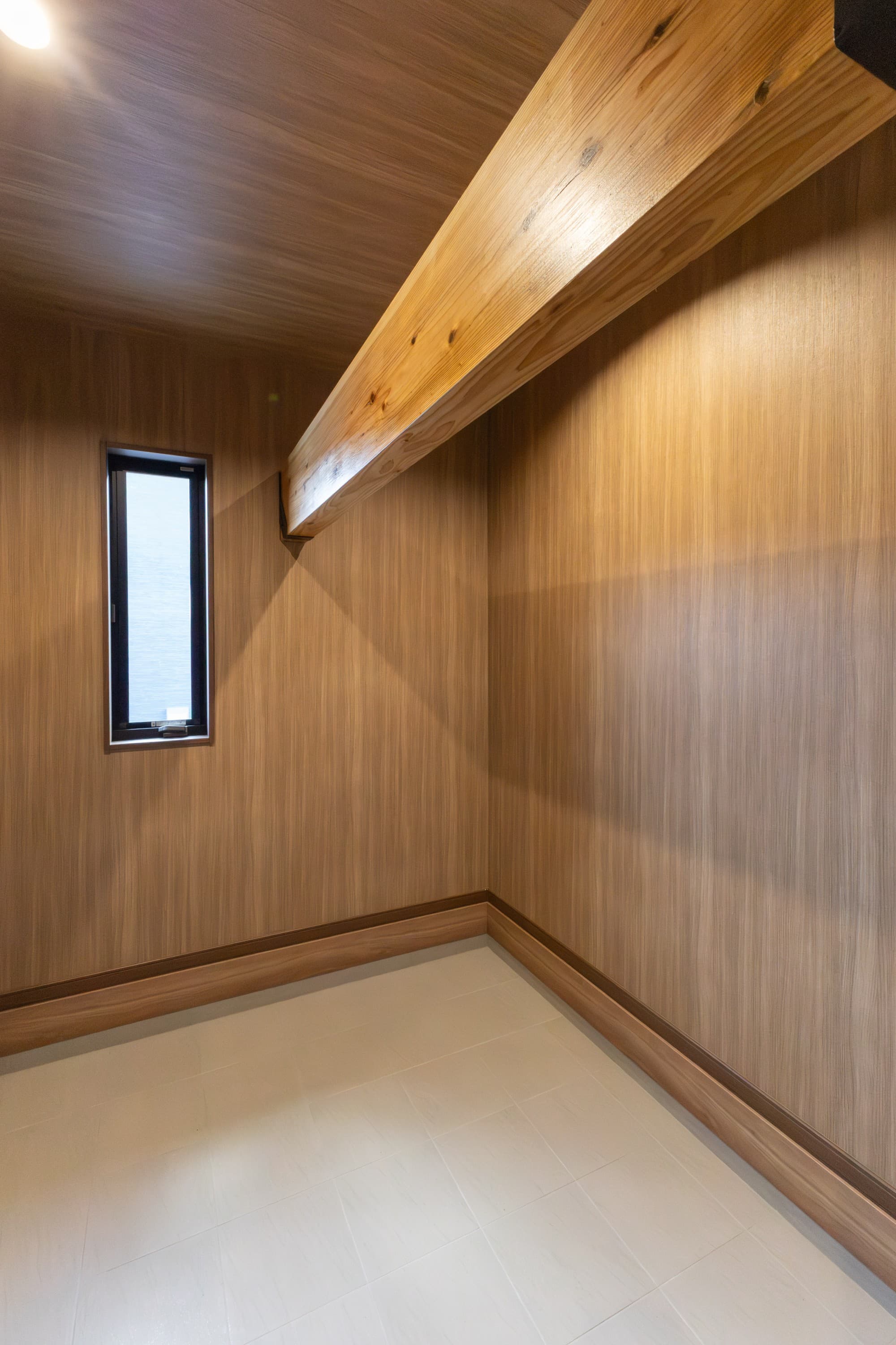 釣り具などの趣味用品を収納できる、ゆとりある玄関土間収納。木目が映える化粧梁をアクセントに、トレーニングスペースとしても活用予定です。