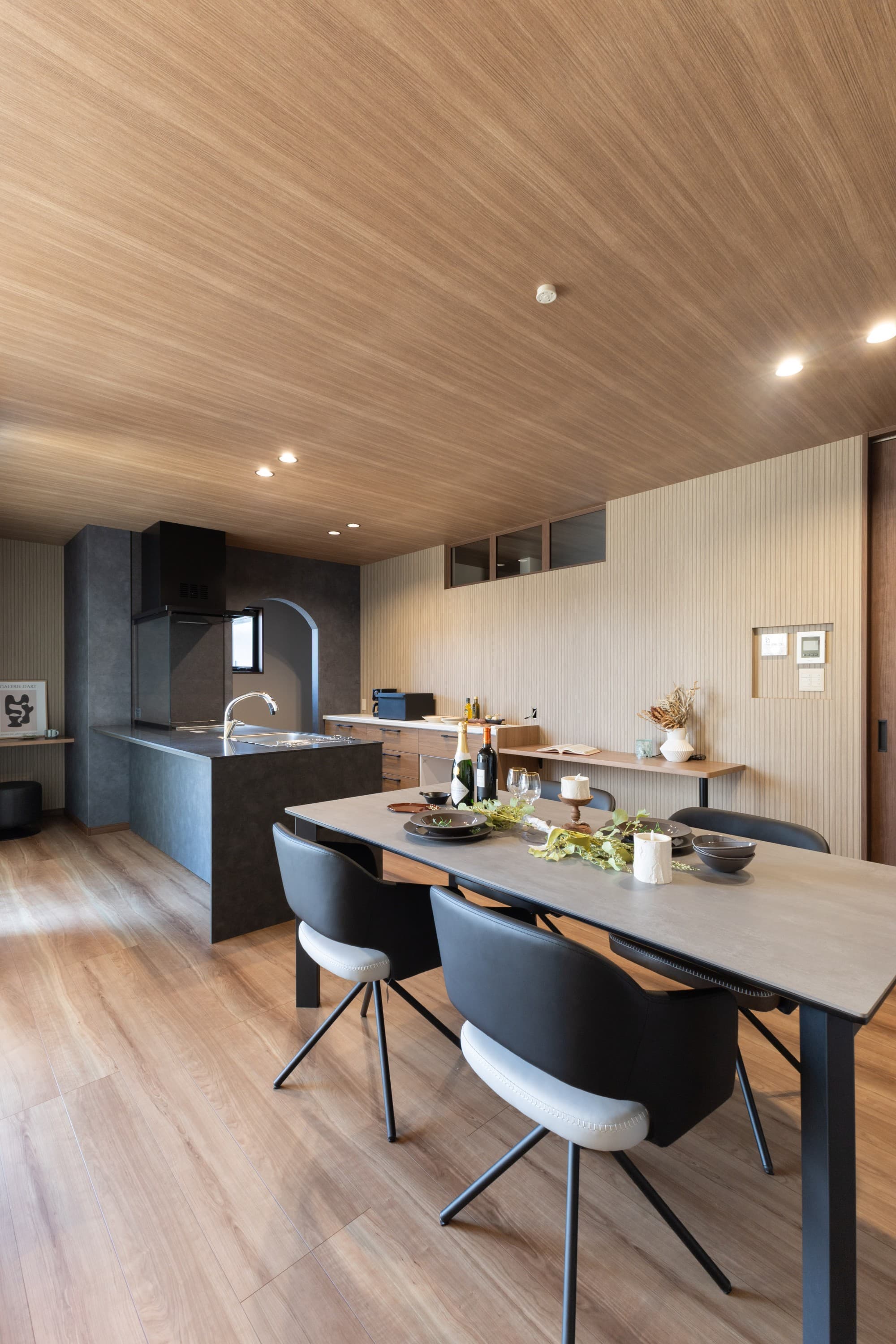 ダイニングテーブルはキッチンと横並びに配置。少し離して設置することで、キッチンまでの動線を短くしています。