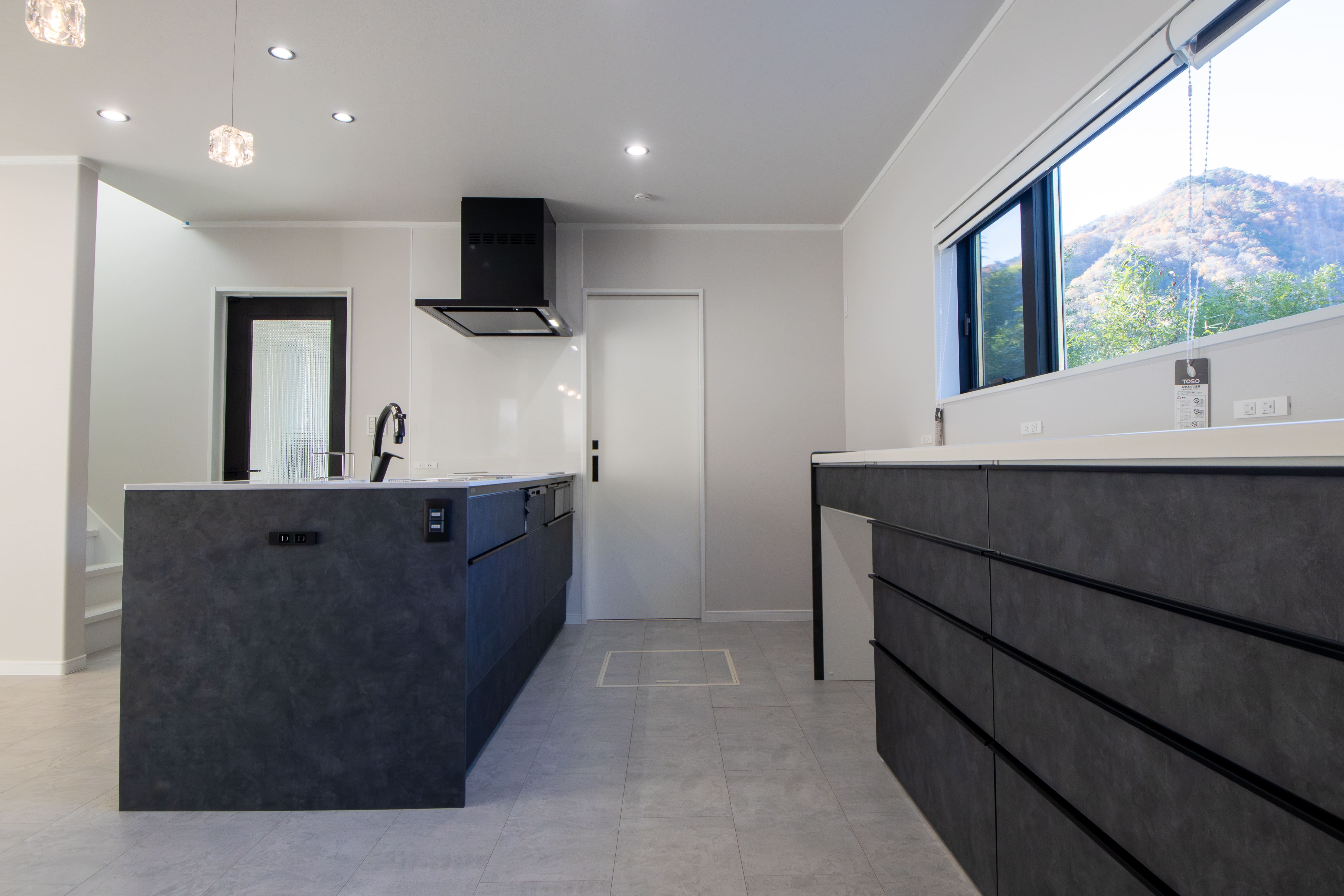 キッチンは、LIXILの「シエラS」、色は「グレージュスタッコ」を採用しました。 水栓とレンジフードをブラックにしていますので、シックな雰囲気になっています。