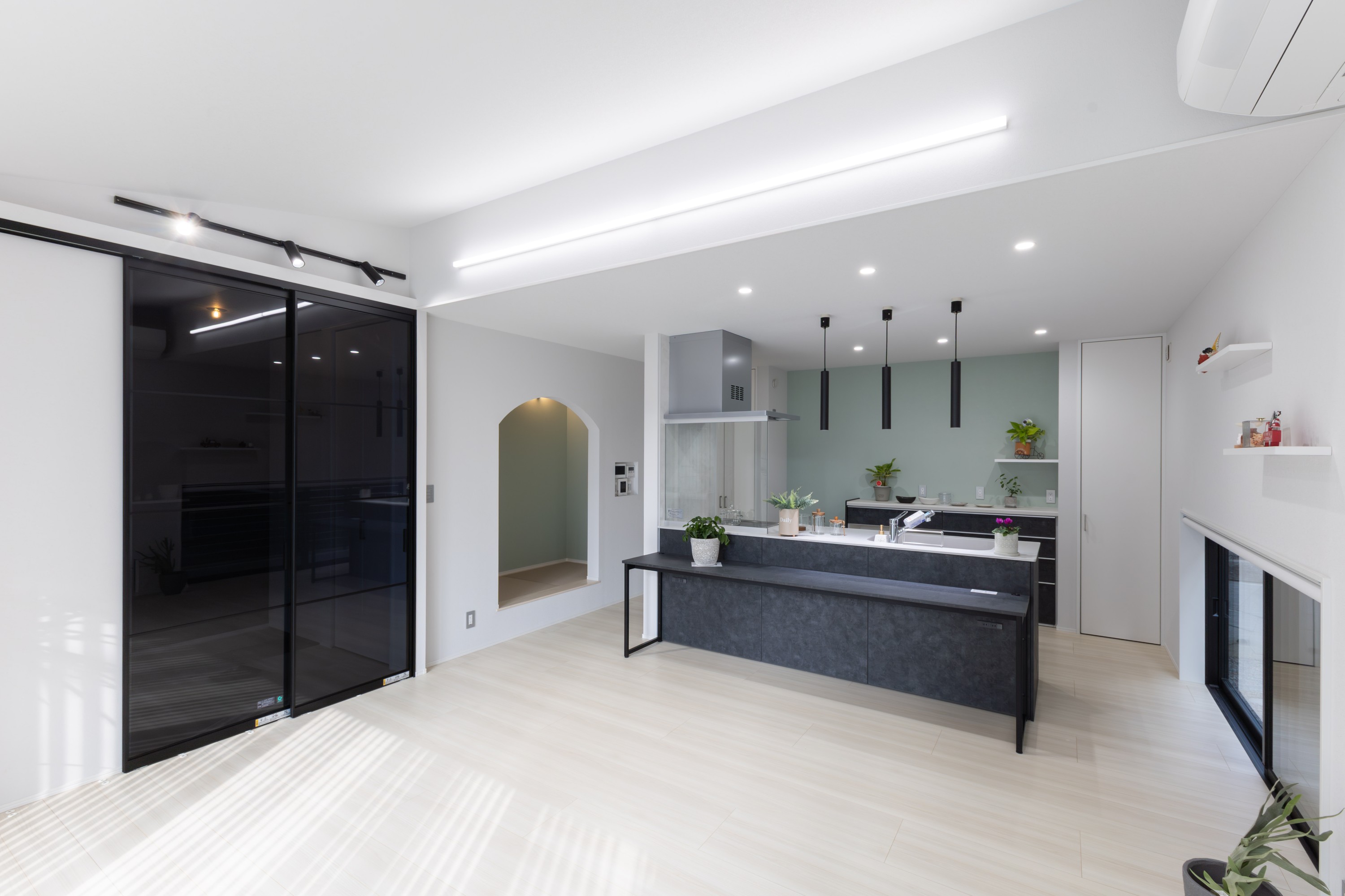 LDKへ続くドアには、デザイン性の高いガラスドアを採用し、空間に抜け感とおしゃれなアクセントを加えました。