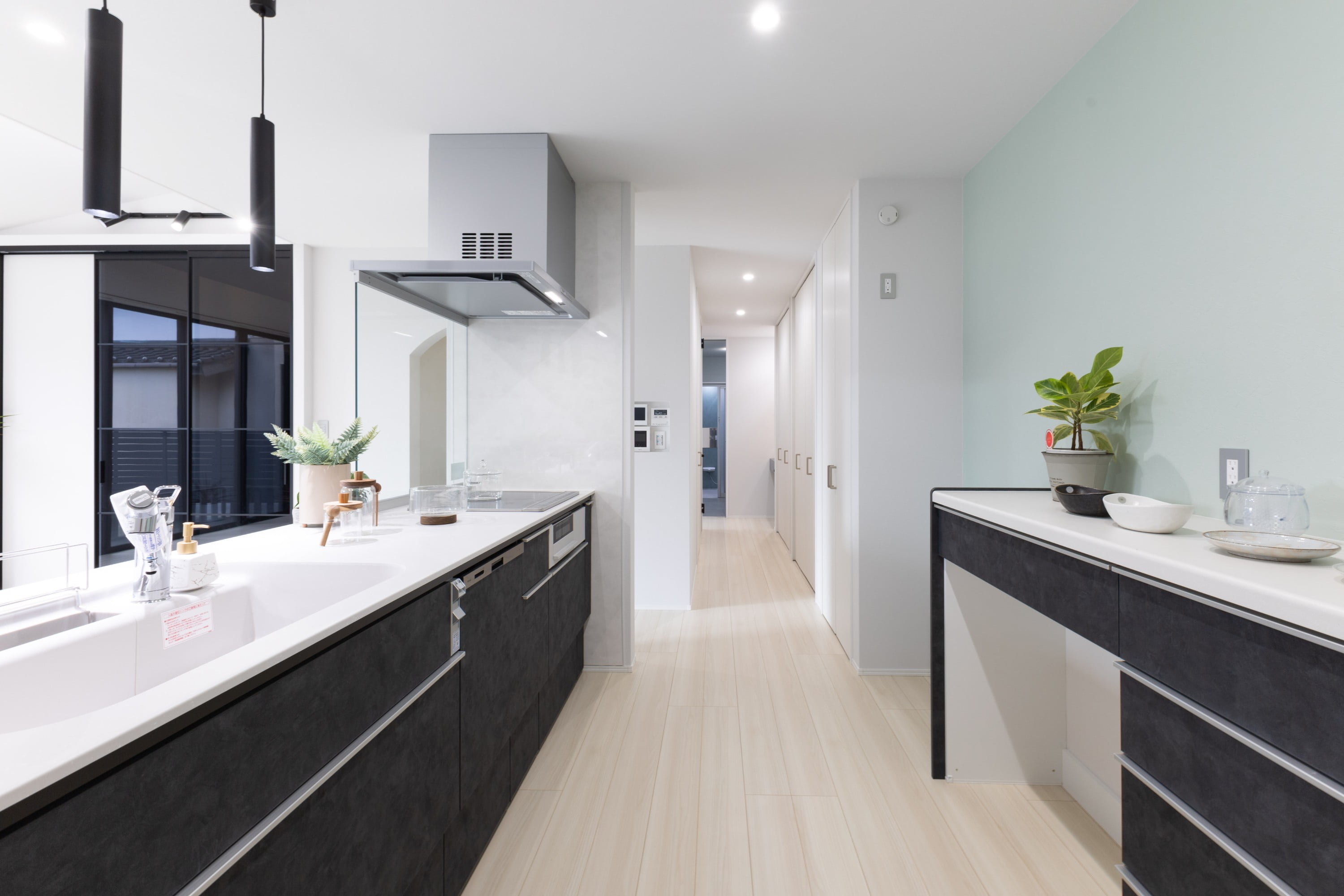 キッチンは「LIXIL ノクト/ペニンシュラI型/色:ブラックスタッコ」を採用。奥には裏動線を設け、収納をすべてまとめて配置することで、家事がスムーズに行える設計にしました。