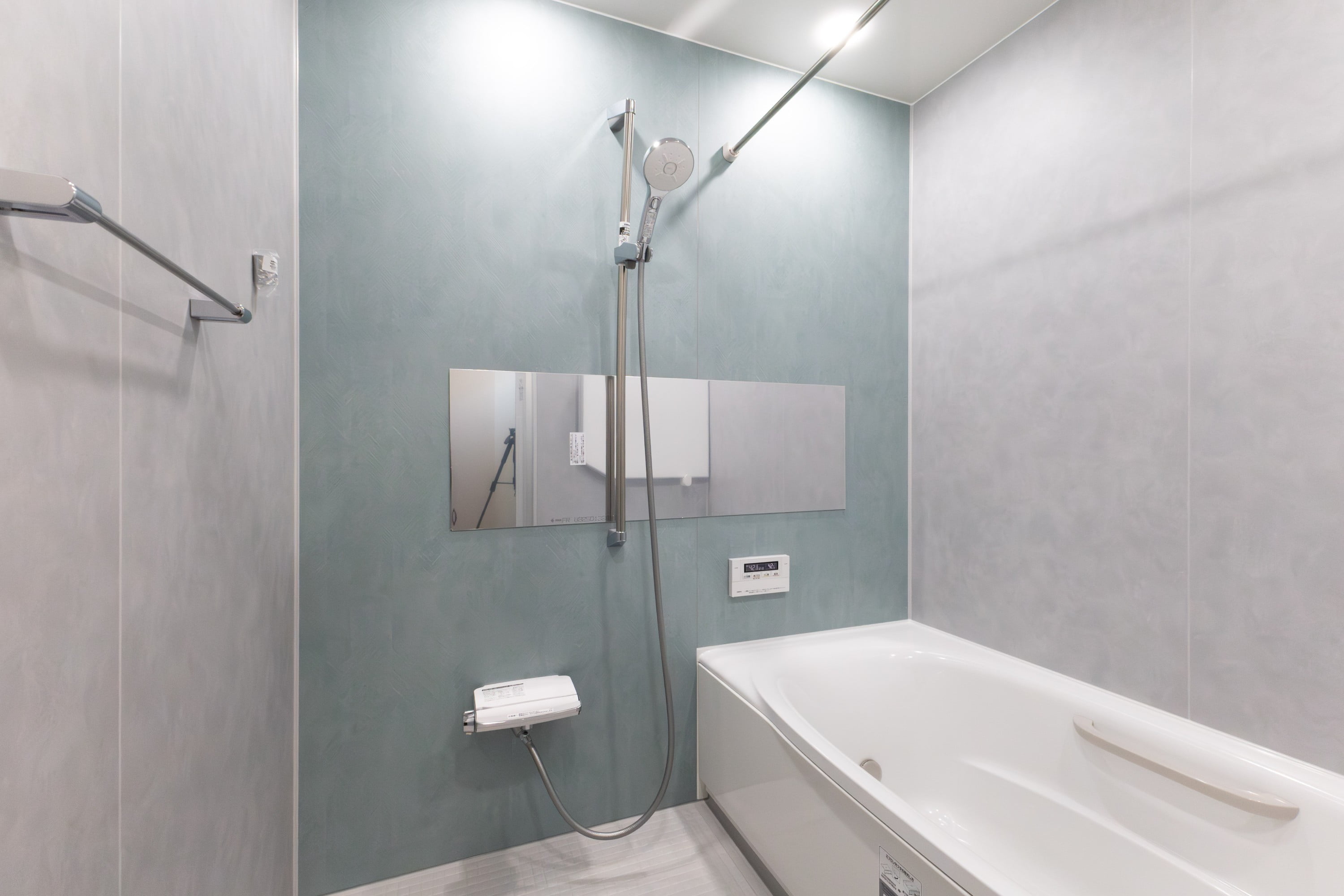 浴室は「LIXIL リデアMタイプ/1618サイズ/アクセントパネルの色:ヘリンボーンミント」を採用しました。