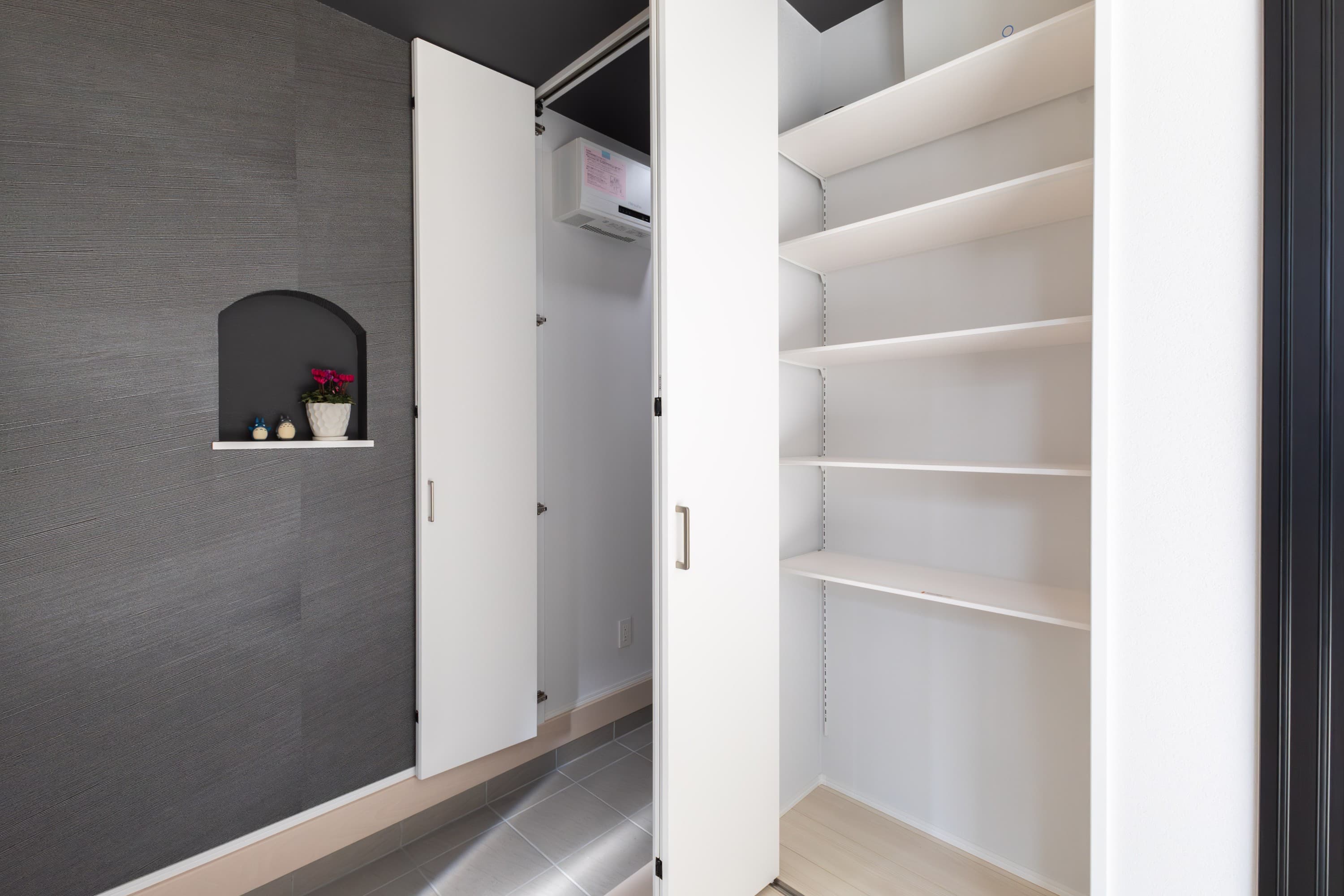 玄関ホールには、土間収納と可動棚収納を設け、靴や日用品をすっきり片付けられる便利なスペースに。
