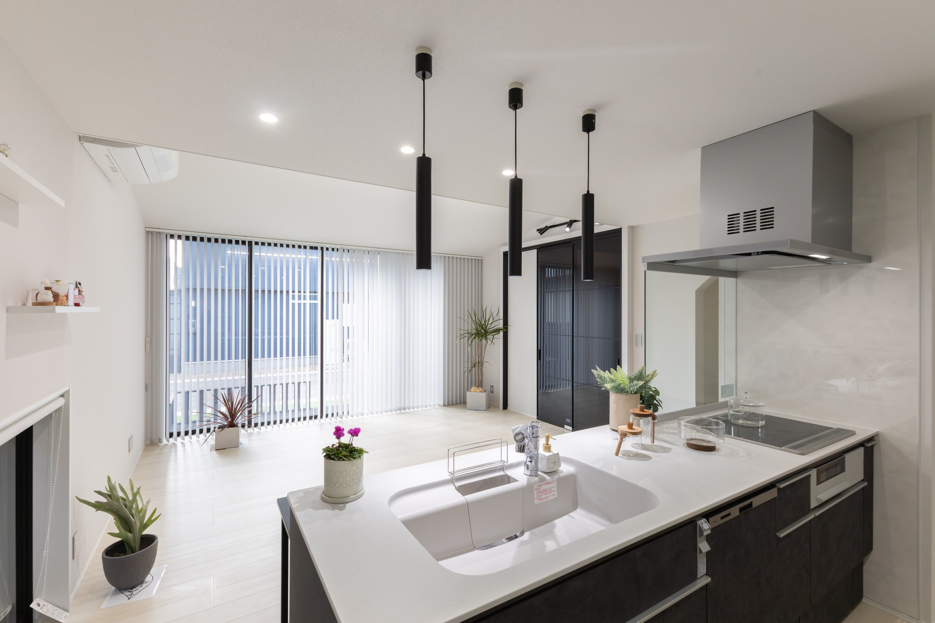 キッチンから庭まで見渡せる間取りに設計し、家事をしながらでも外の景色やお子さまの様子を感じられる快適な空間。