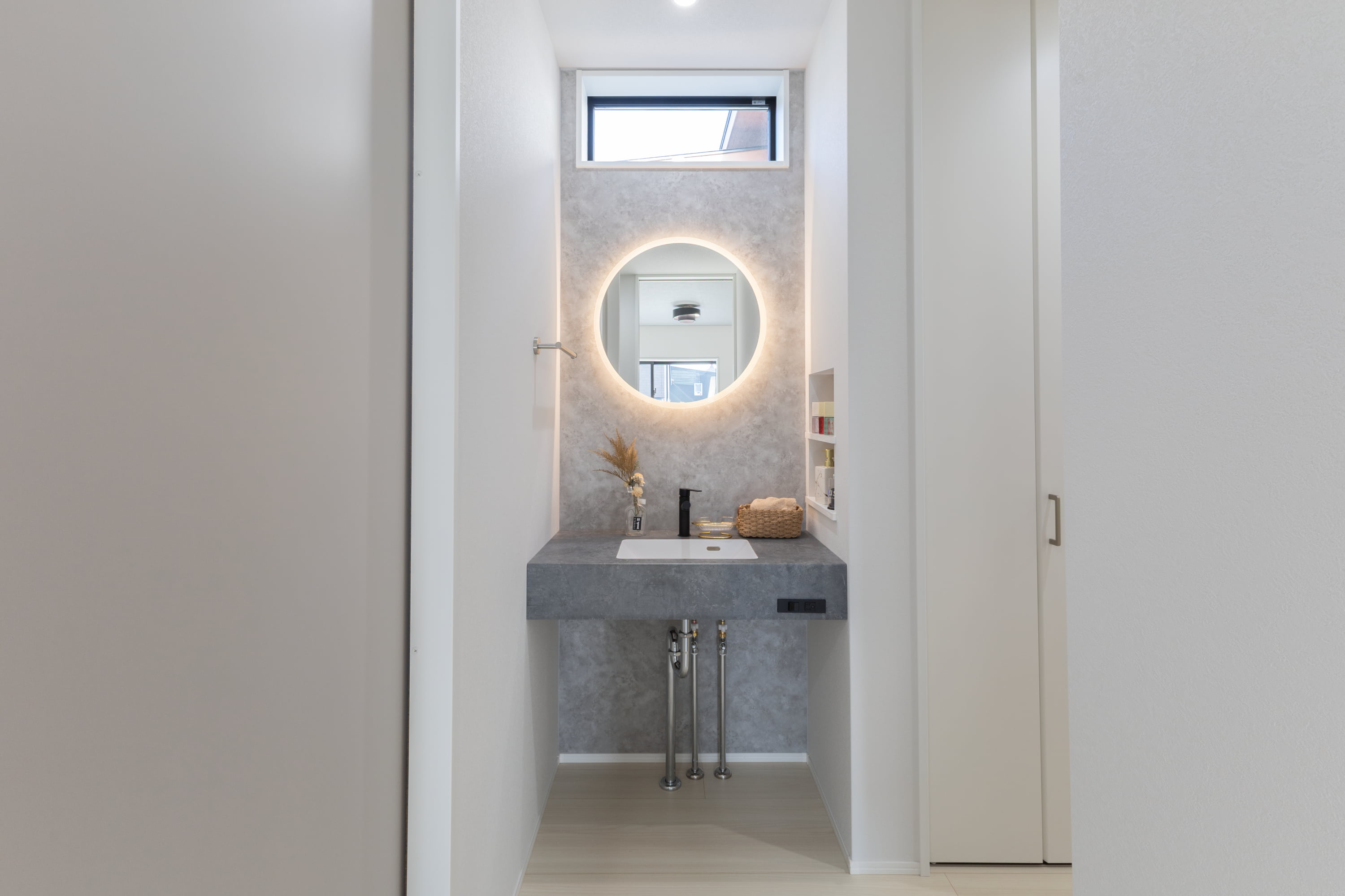 洗面台には「アイカ工業 シームアンダーボウル」を採用し、カウンターは造作で仕上げました。