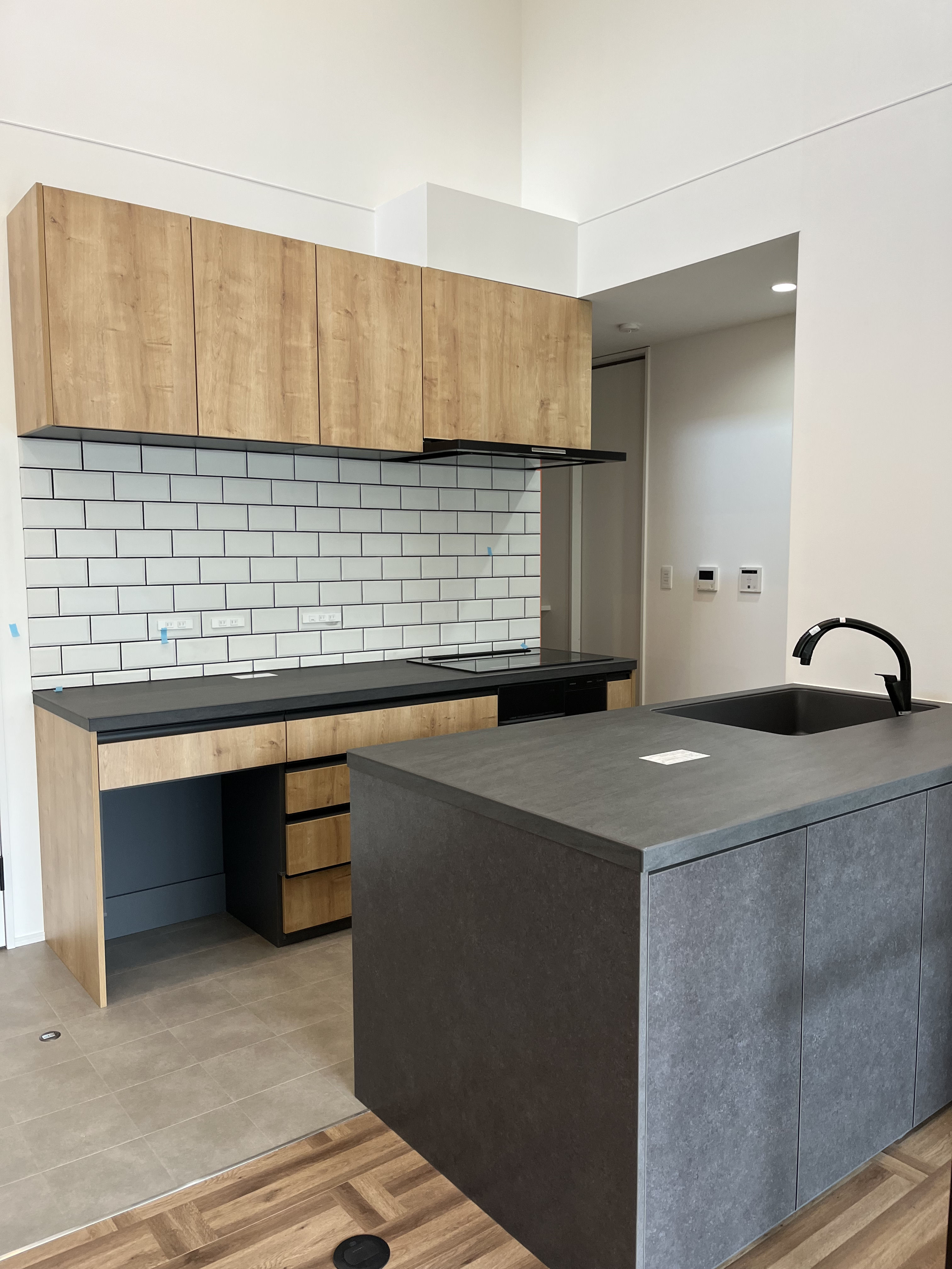 キッチン:システムキッチン リシェルSI 〈LIXIL〉 扉カラー:バサルトブラック セラミックトップ:バサルトブラック シンク:ハイブリッドクォーツシンク コズミックグレー 水栓:ハンズフリー水栓 浄水器ビルトイン型 食器洗い乾燥機:ミーレ製 深型タイプ レンジフード:よごれんフード CLSタイプ ファニチャー:システムキッチン リシェルSI〈LIXIL〉 扉カラー:ライトグレイン ウォールキャビネット ダウンウォール付