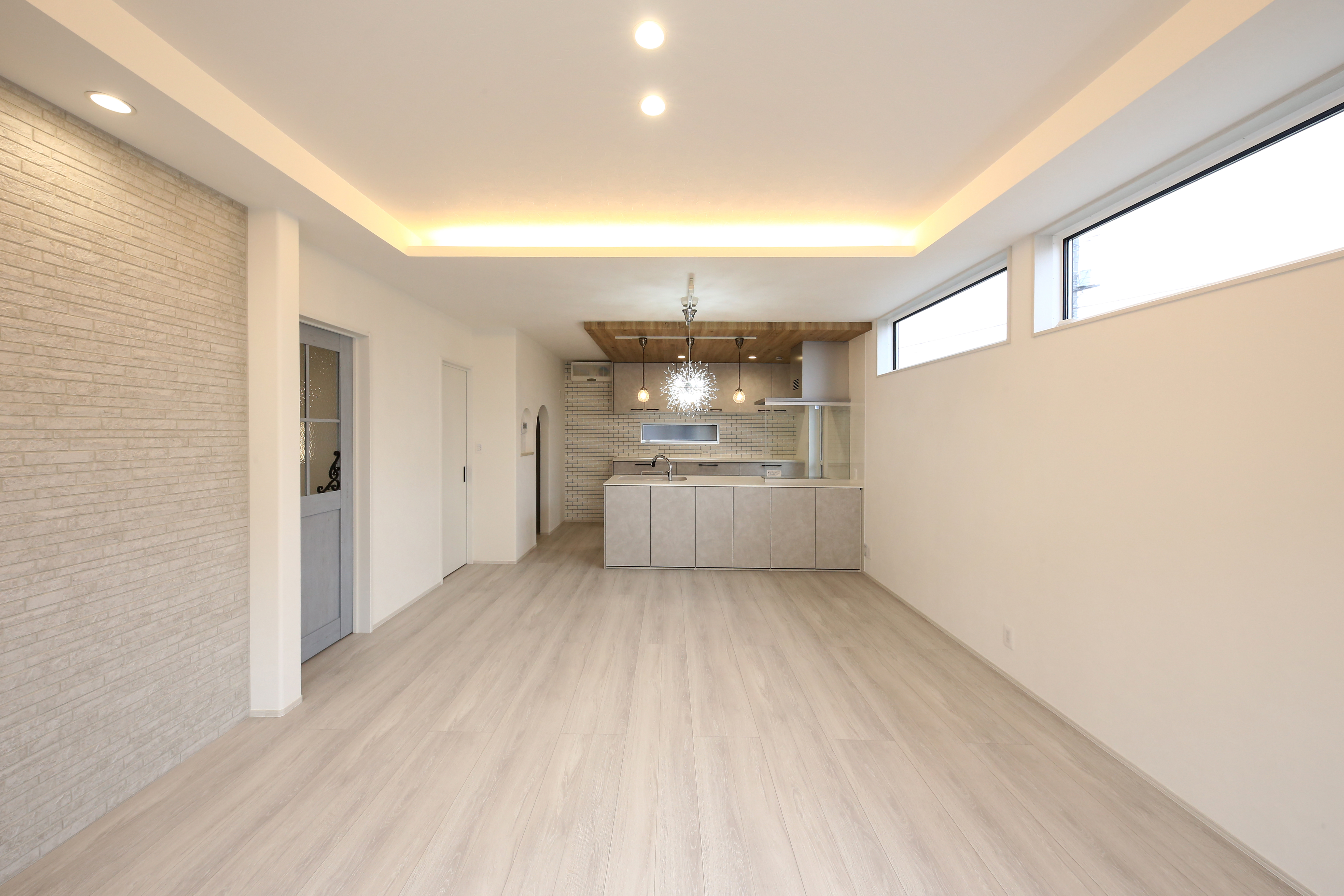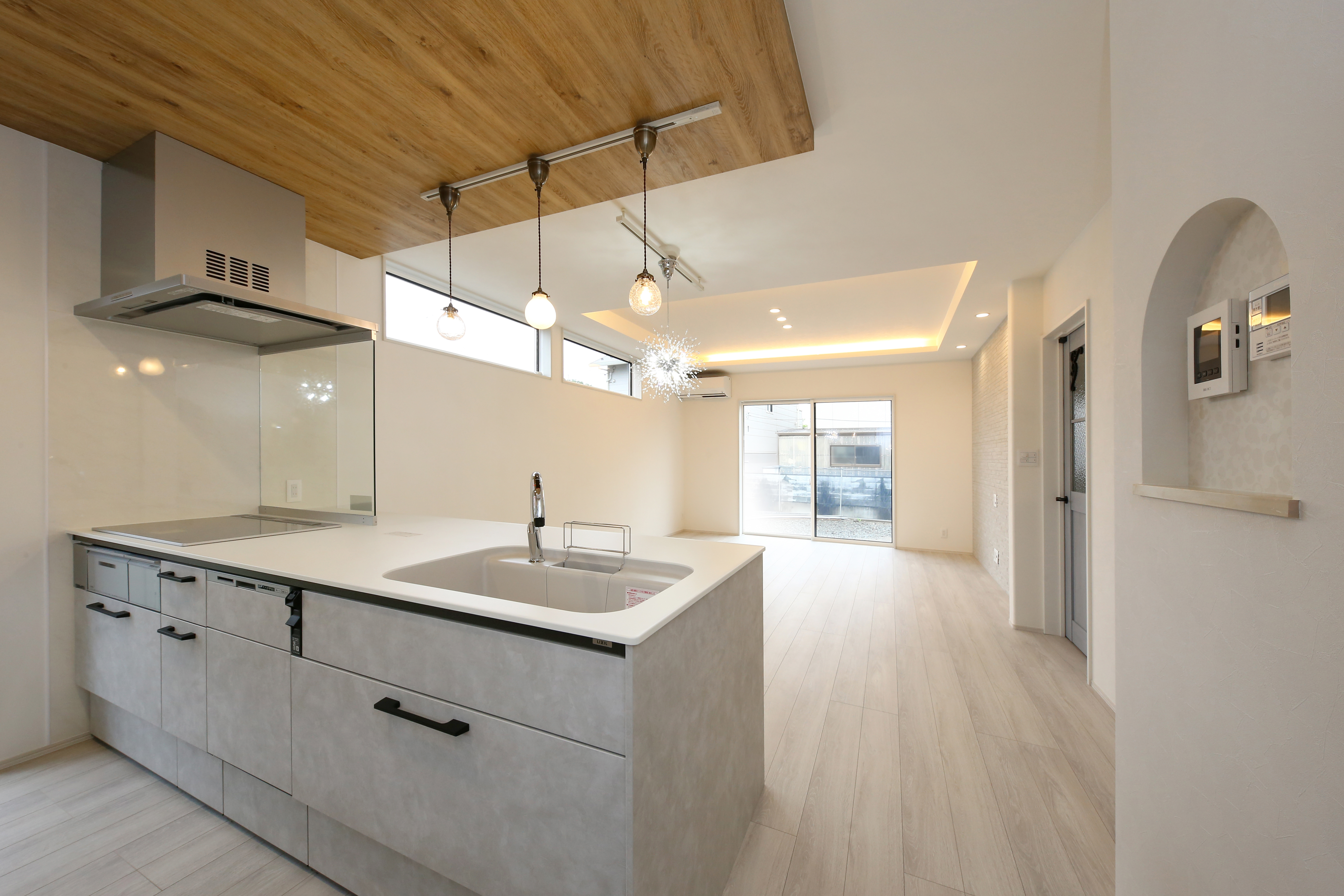 キッチンの天井は下がり天井を採用し、空間にメリハリをつけています。